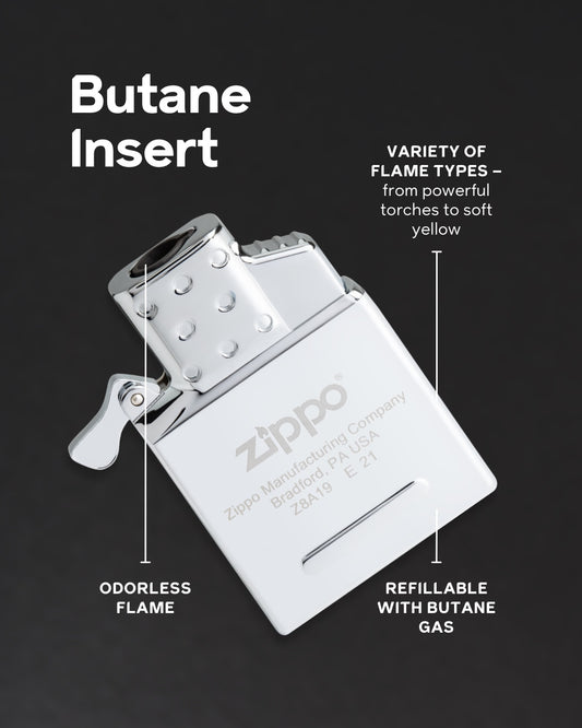 Customise your Zippo lighter with a new lighter insert. Choose from single and double torch butane or rechargeable arc options. The pressurised butane inserts offer an odourless flame, while the arc offers a completely windproof flame source that can be easily recharged. Fits all regular-sized Zippo lighter cases. Does not fit Slim or 1935 Replica cases.