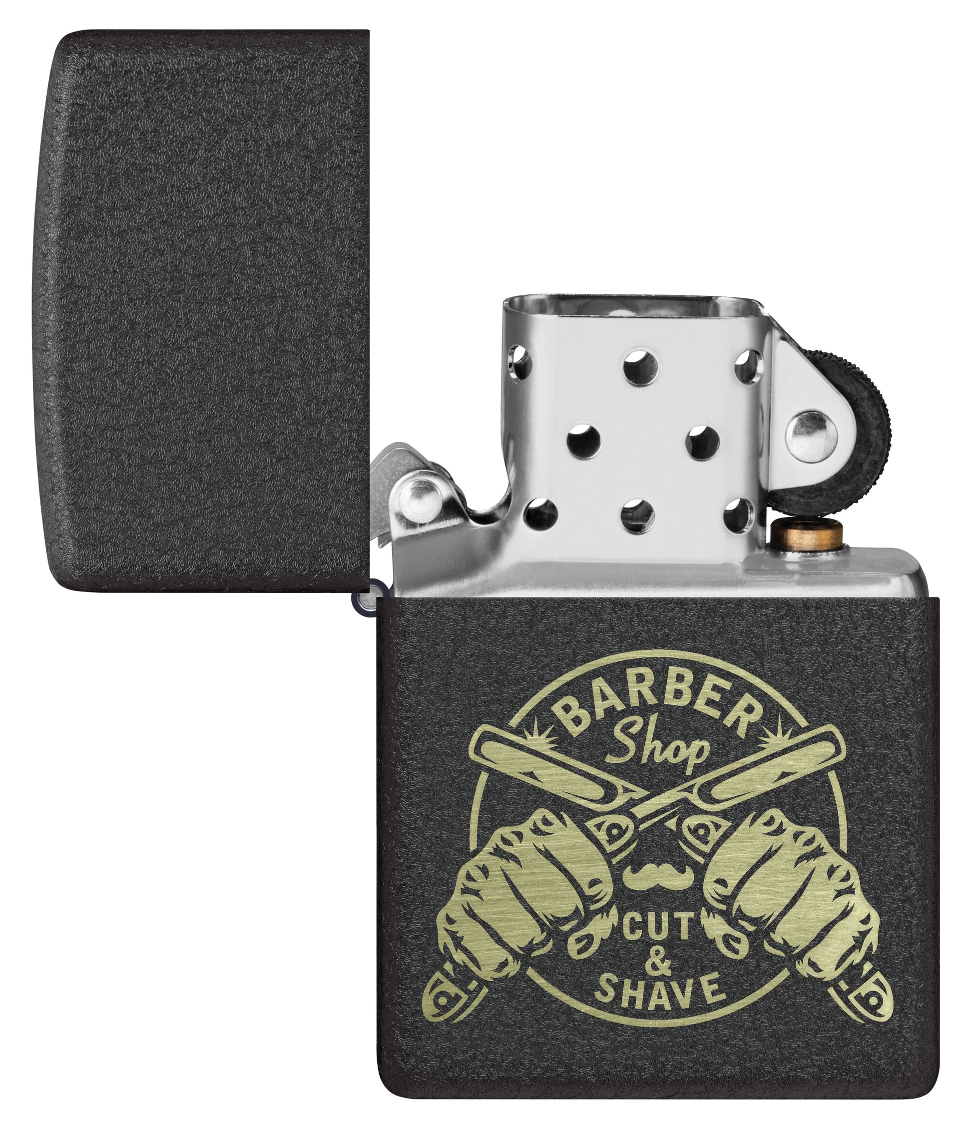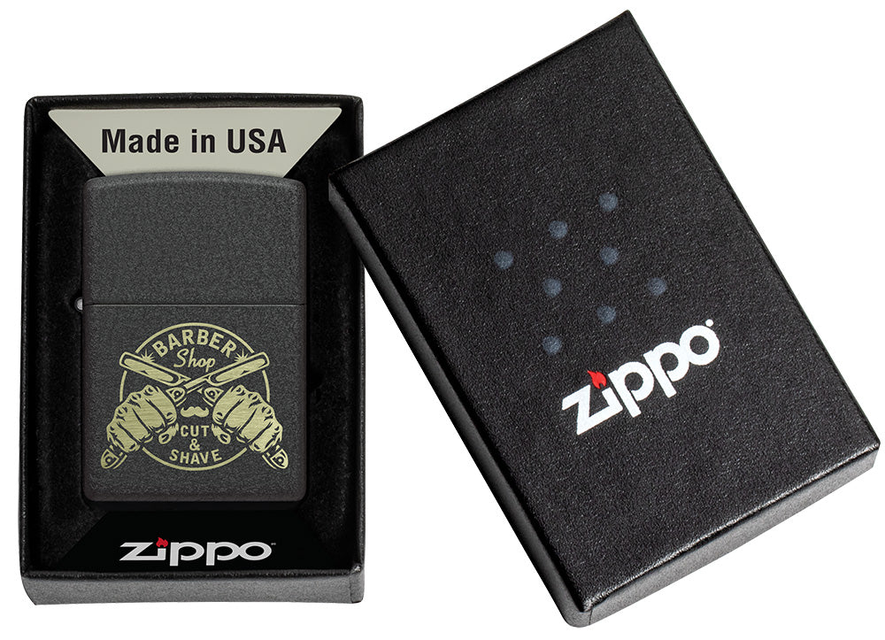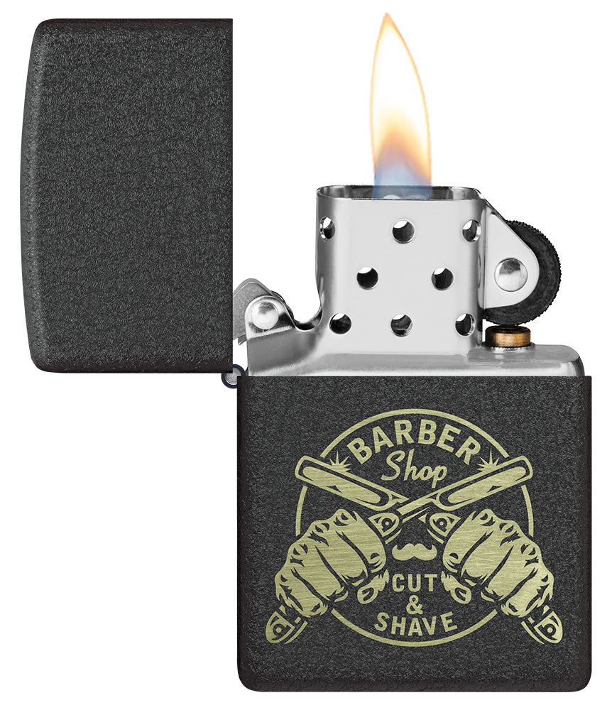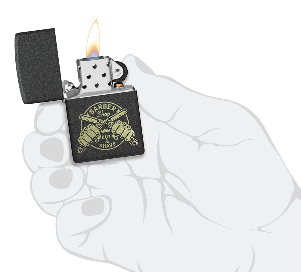 A classic barber shop design is laser-engraved onto the iconic Black Crackle lighter in luxurious brass tones for a nostalgic addition to any collection.