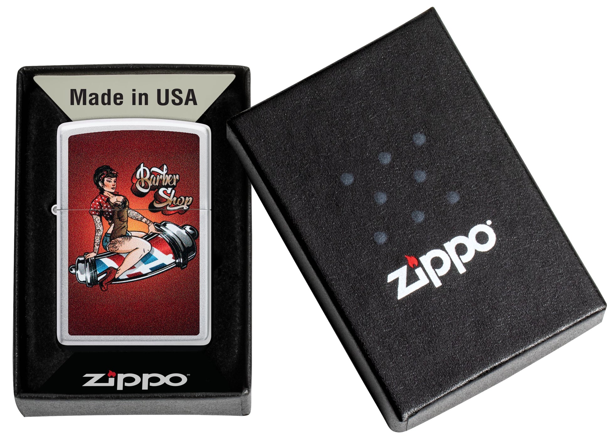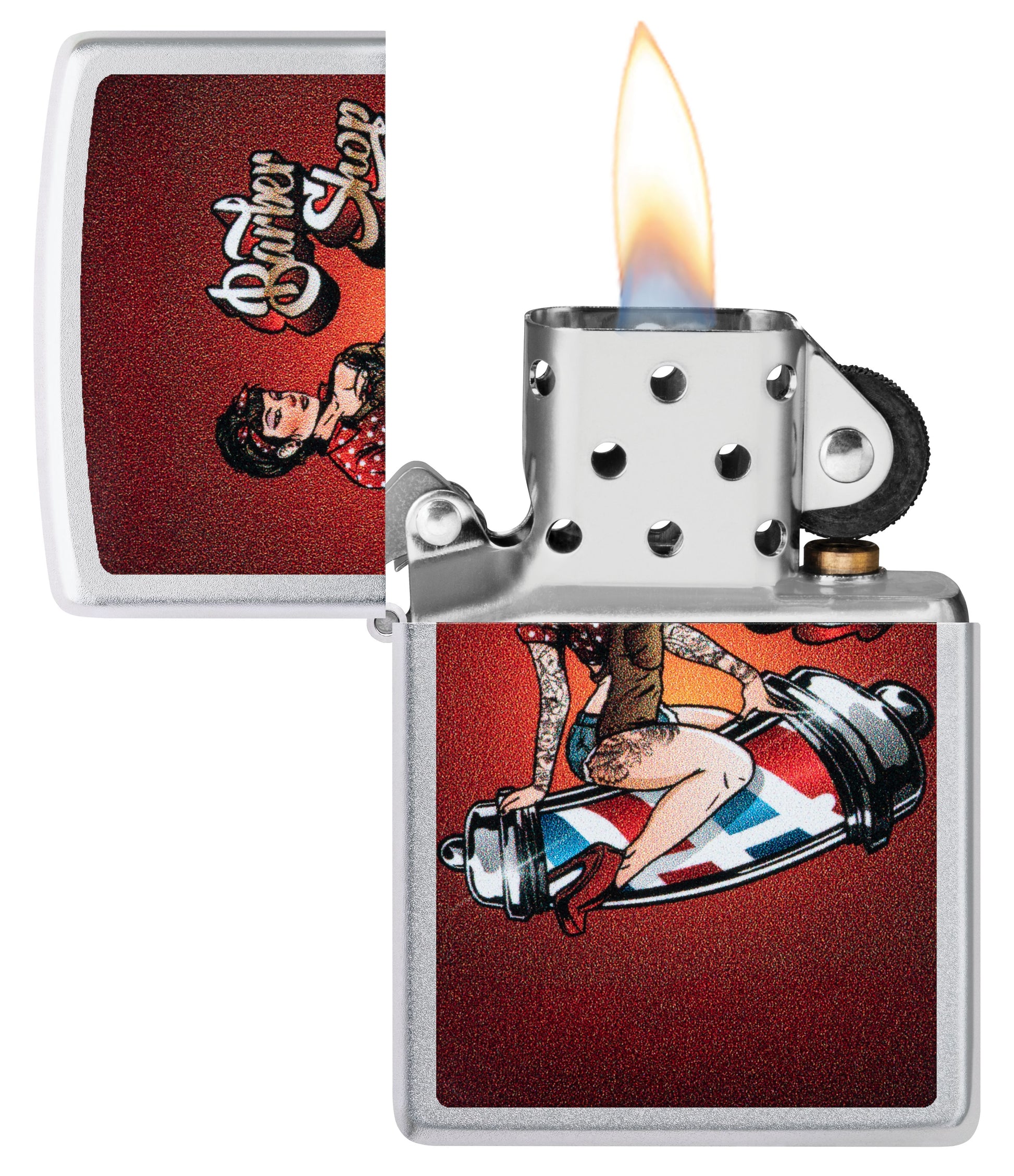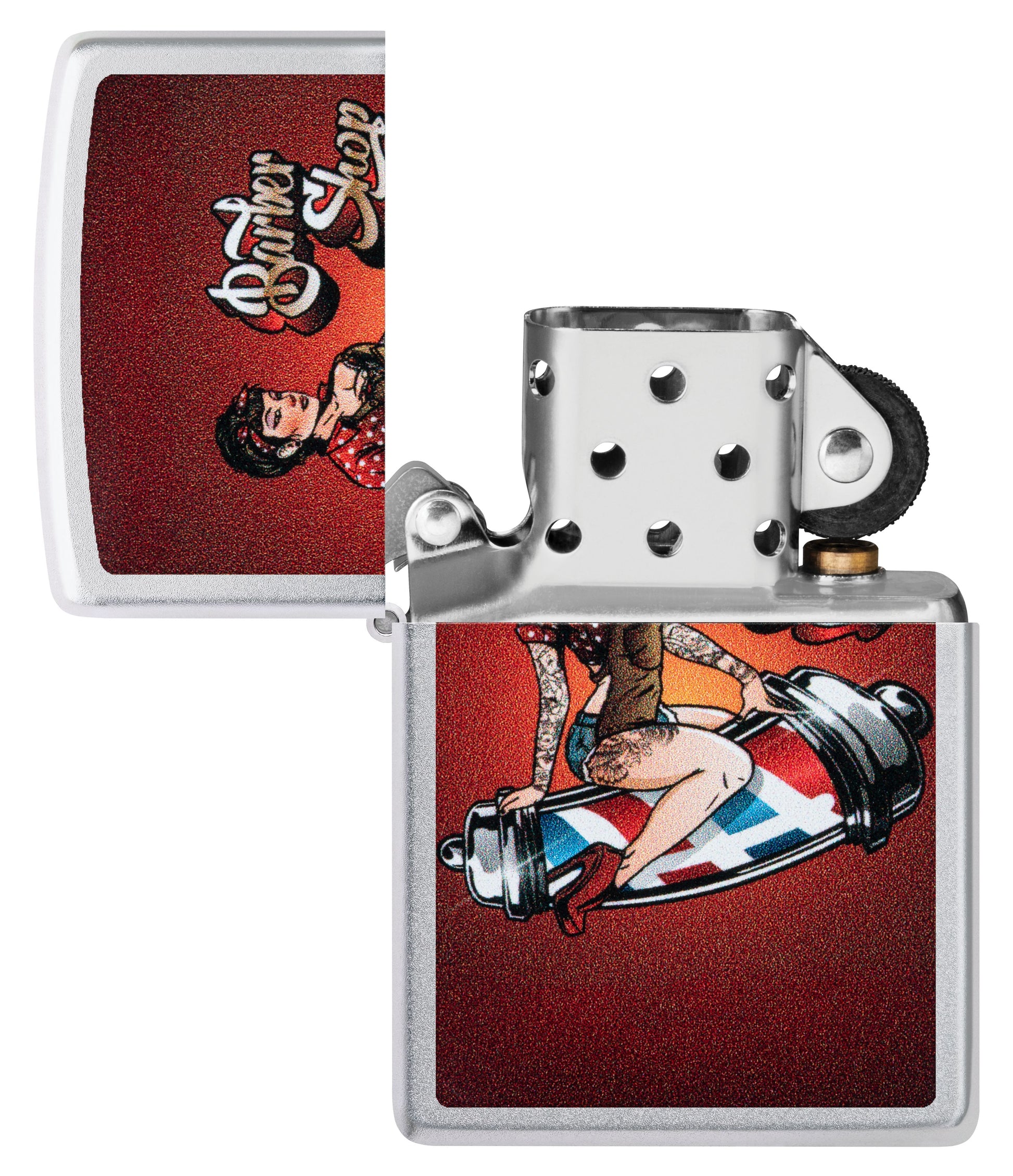 A classic pinup model poses on a barber shop pole on this Satin Chrome lighter in a vintage-inspired Color Image design.