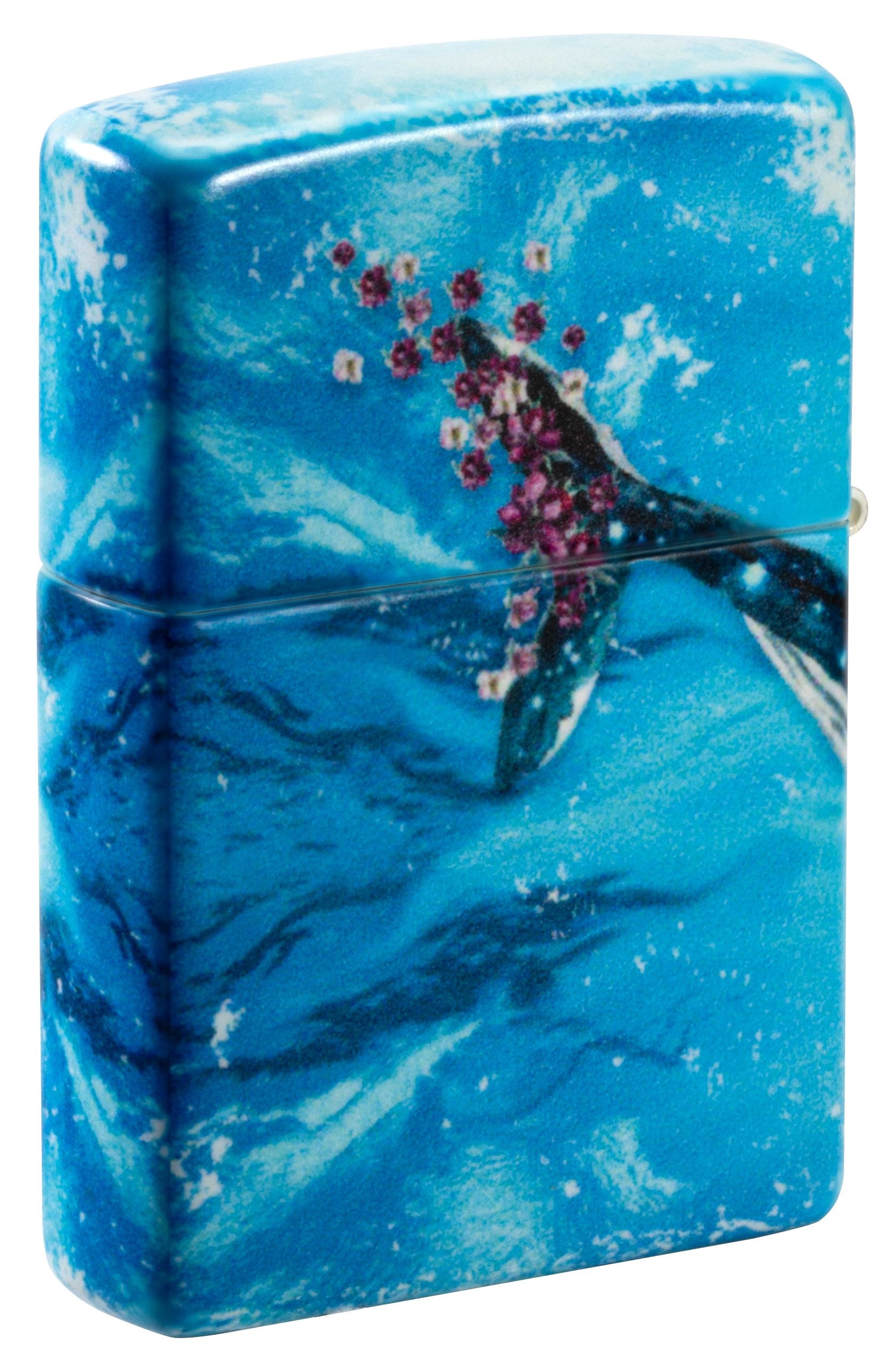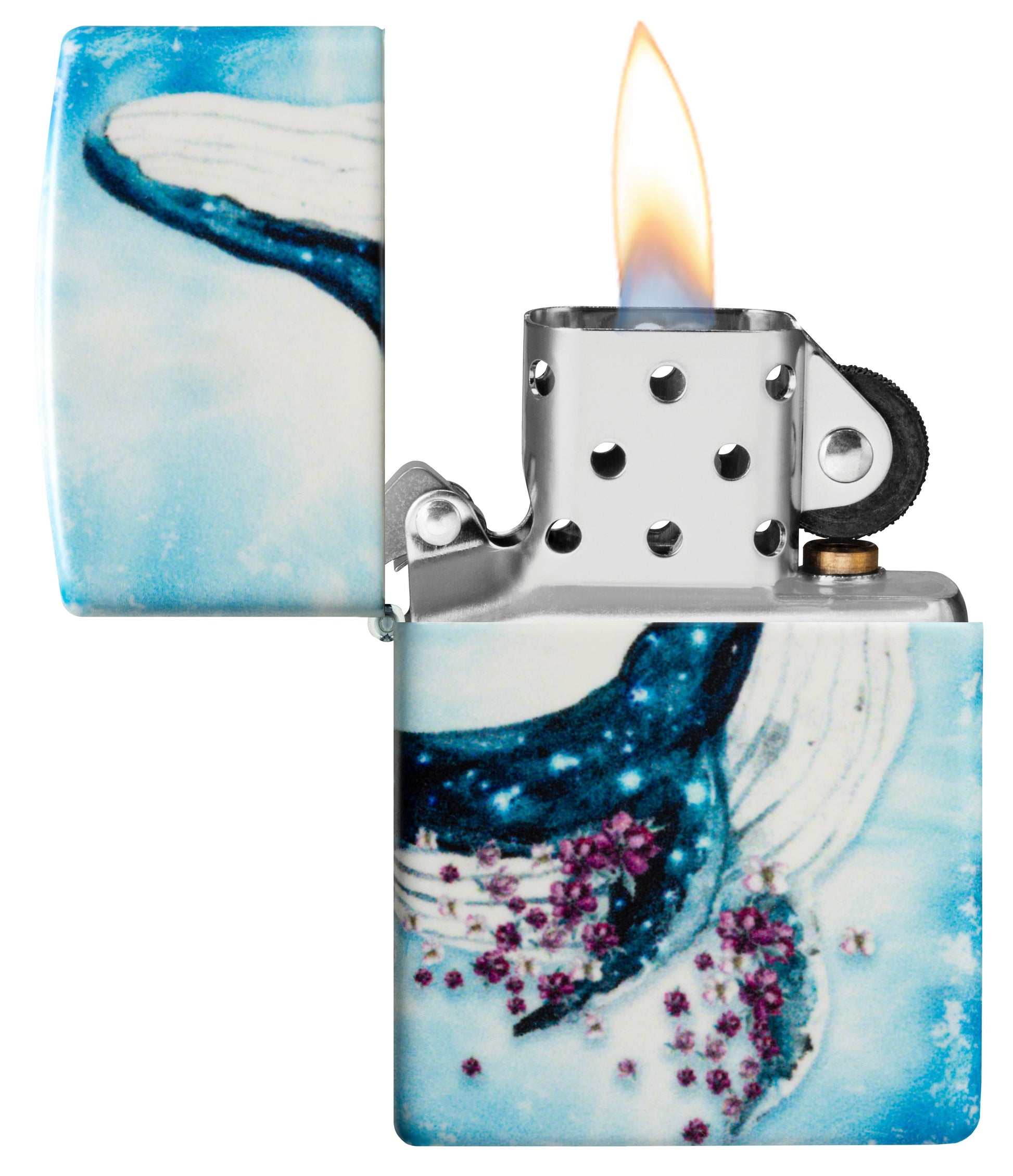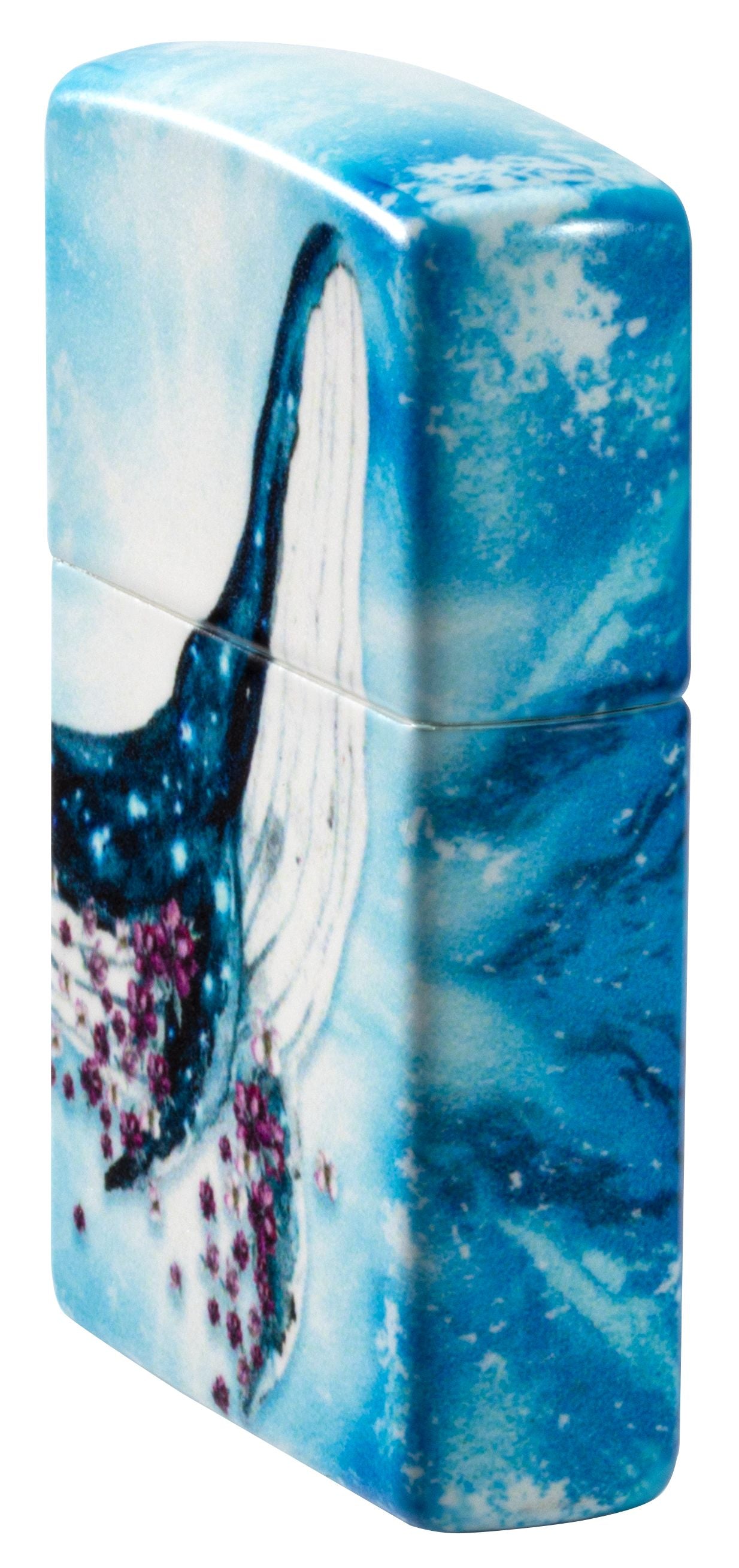 A majestic blue whale gracefully swims among vibrant flowers on this vibrant and immersive 540 Color lighter.