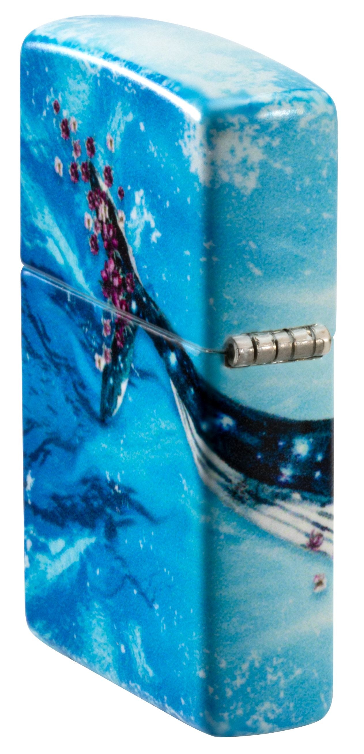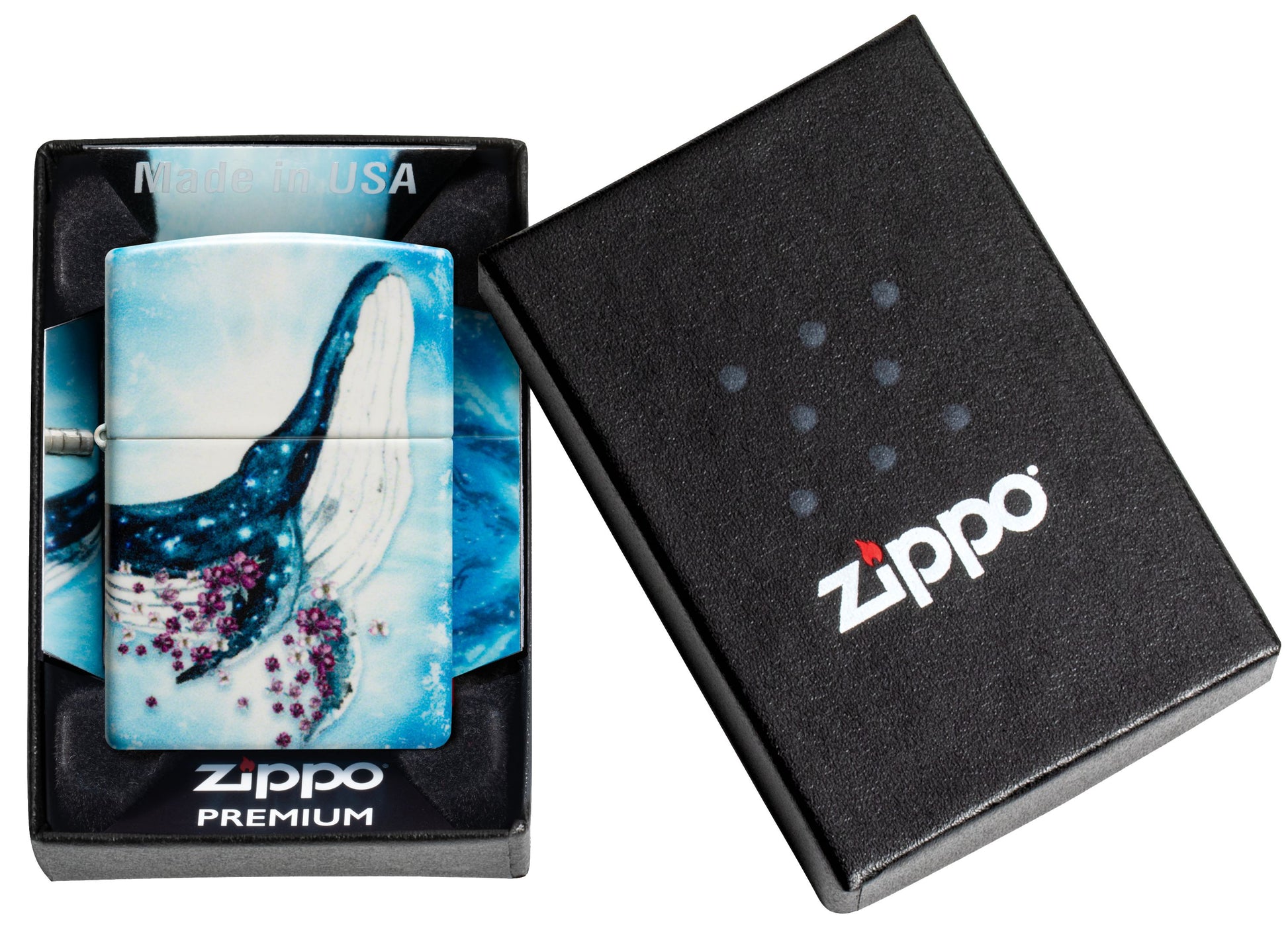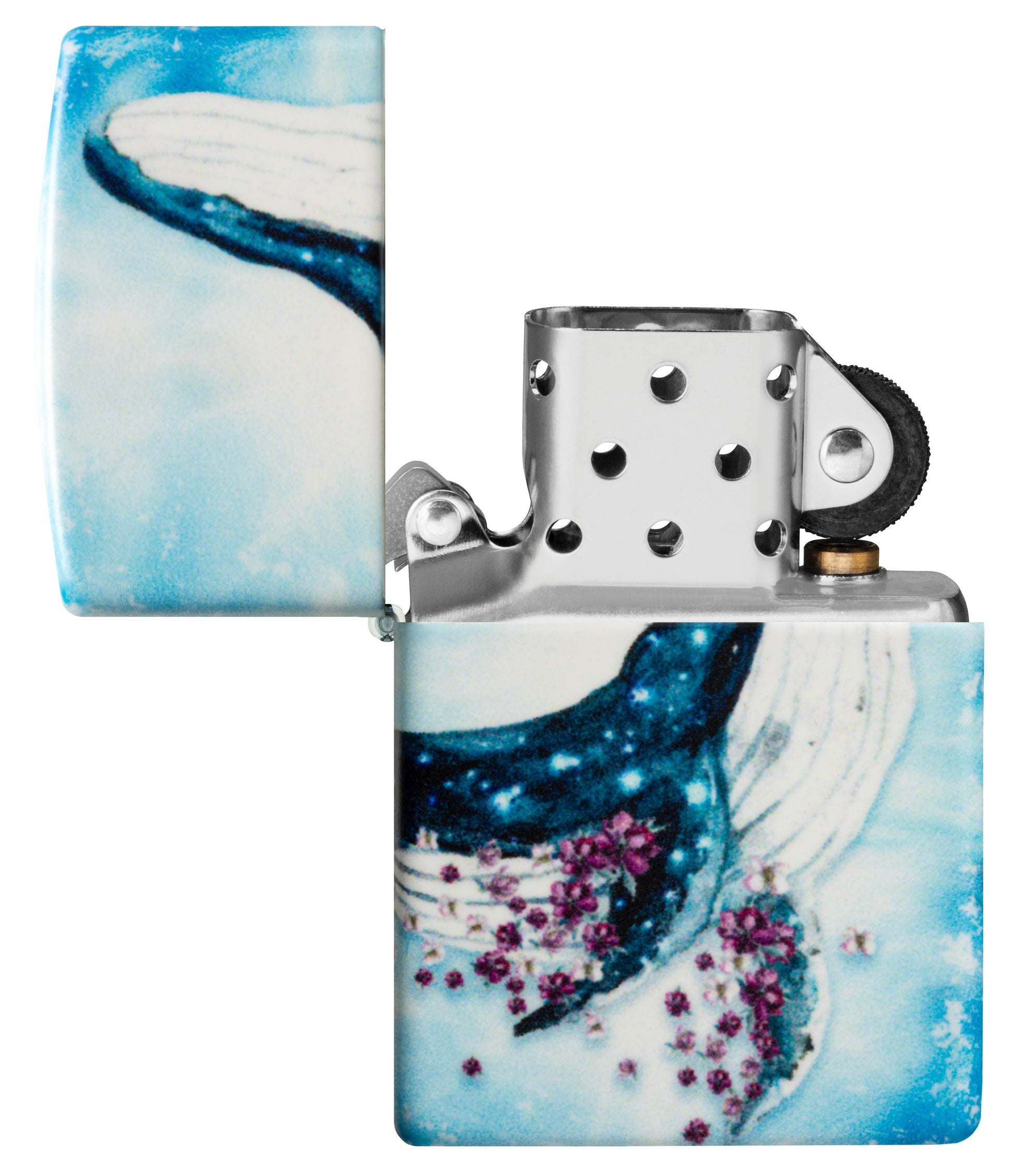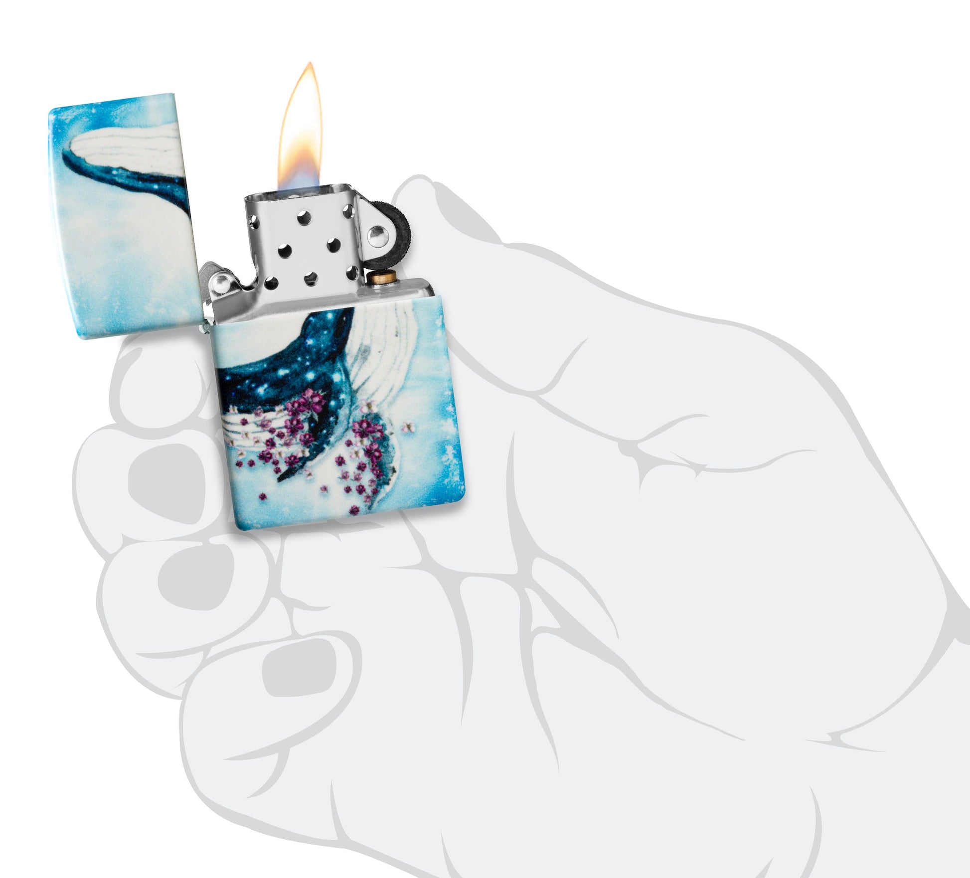 A majestic blue whale gracefully swims among vibrant flowers on this vibrant and immersive 540 Color lighter.
