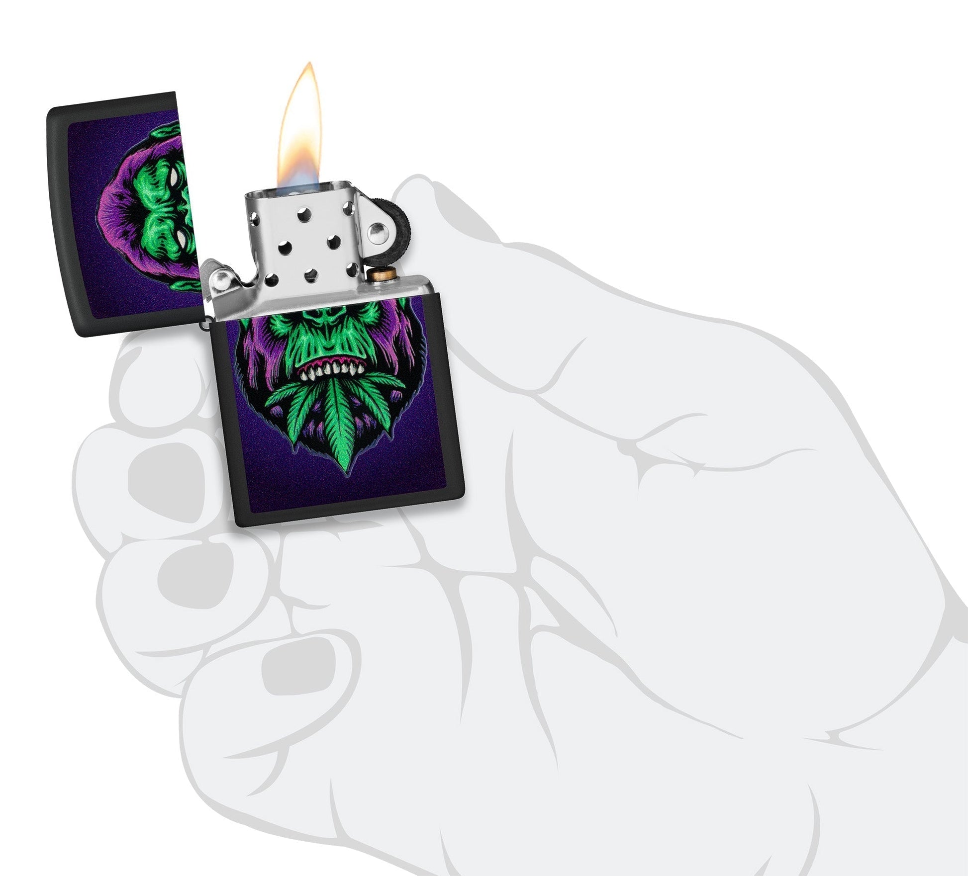 The fascinating cannabis gorilla glows under blacklight, attracting all eyes. This powerful image symbolises strength, closeness to nature and a certain wildness. With its detailed colours and the glowing blacklight motif, the lighter offers an impressive display. The black light function adds an extra dimension to the motif as it comes to life with a fascinating glow under UV light. A real eye-catcher for anyone who appreciates the unique combination of art, nature and technology.