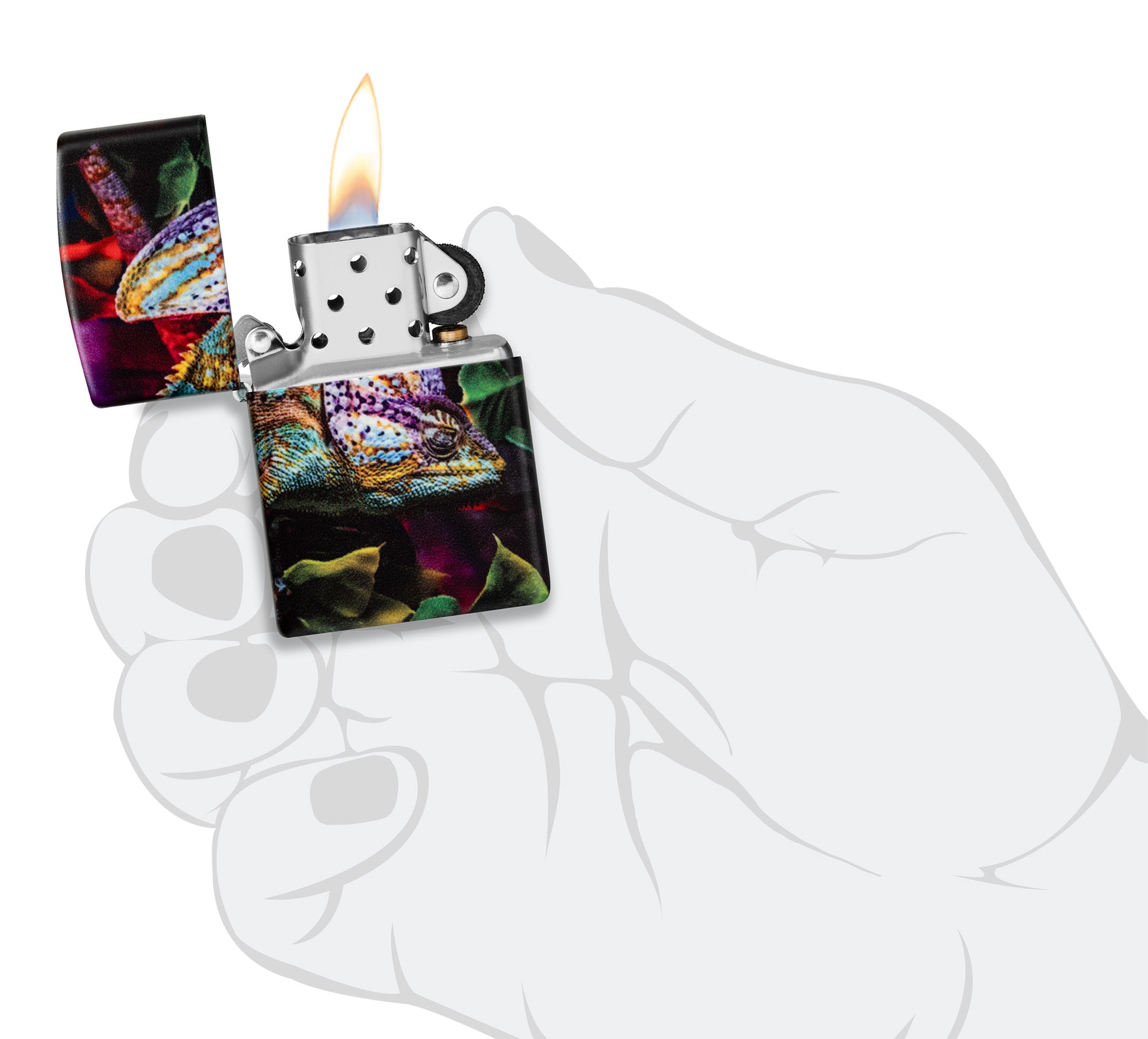 A colorful chameleon nestles among vibrant foliage on in a stunning 540 Color design that seamlessly stretches around every surface of the lighter.