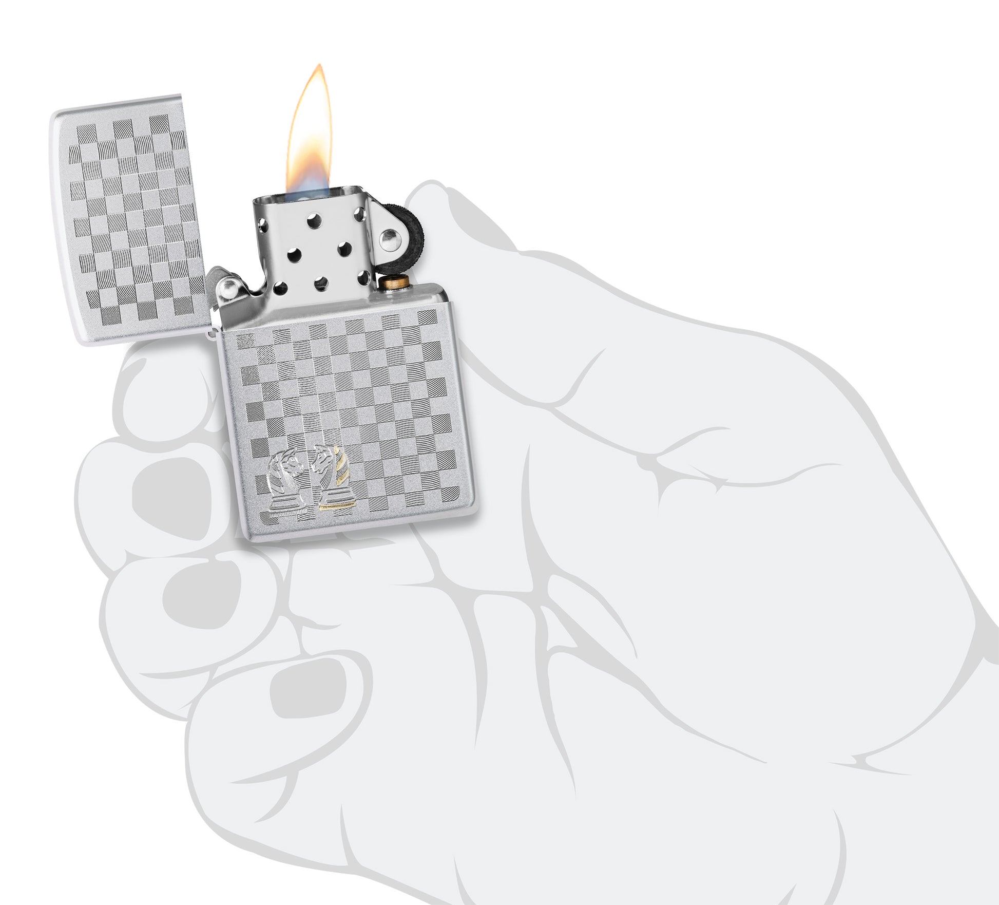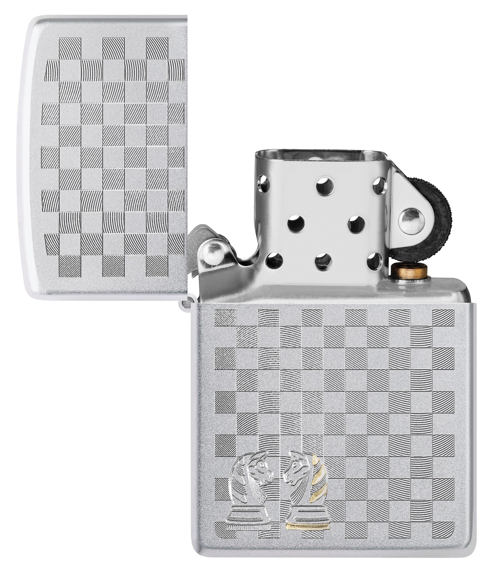 Whether you're a fan of chess or fascinated with tactical strategy, you'll love this classic Satin Chrome lighter. A classic chessboard is engraved across the front surface, anchored by duelling Knights in an intricate Auto Two-Tone design.