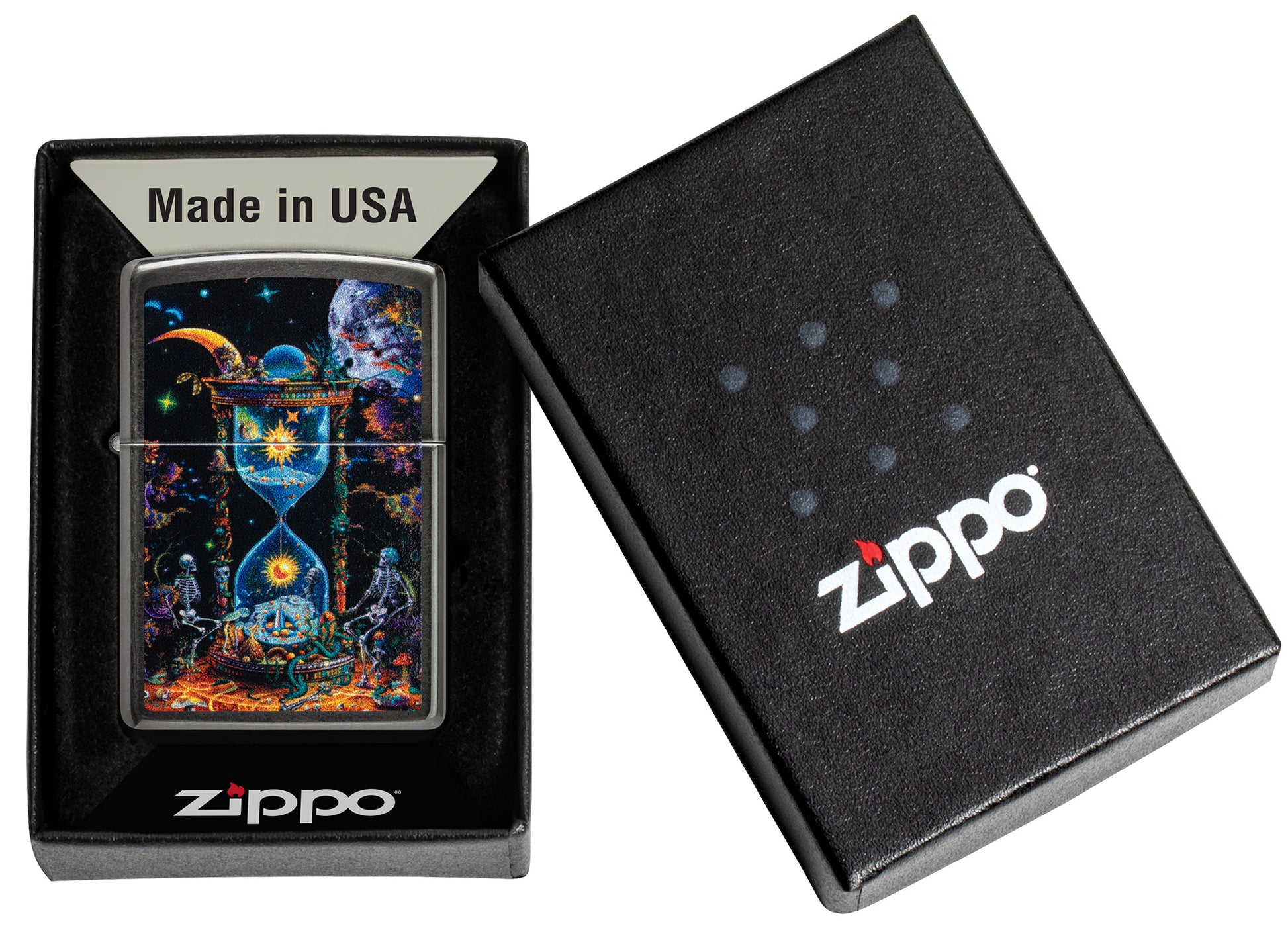 Life, death and the cosmos are pictured in perfect balance on this classic Grey lighter. Time and space form a perpetual hourglass in a mystical Color Image design.