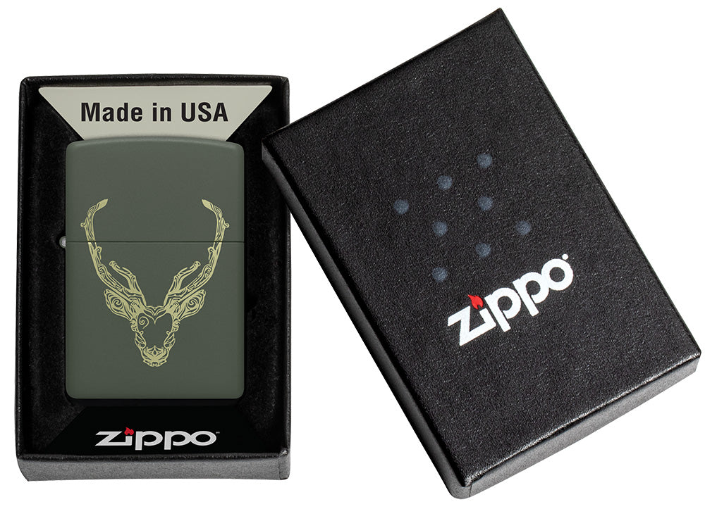 Perfect for any outdoor or nature enthusiast, this classic Green Matte lighter is laser-engraved with a beautifully detailed deer, which is revealed in stunning brass tones.