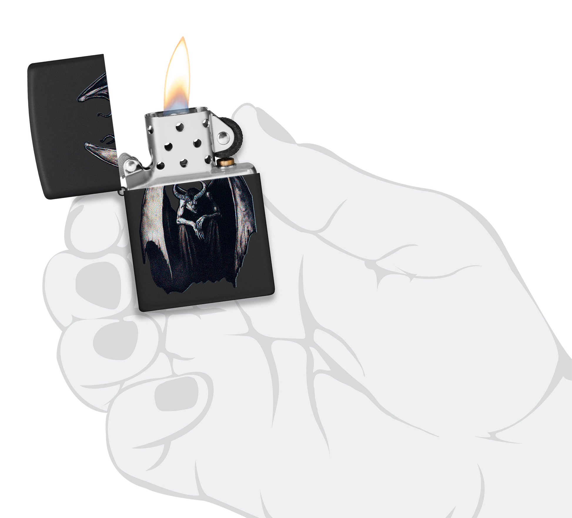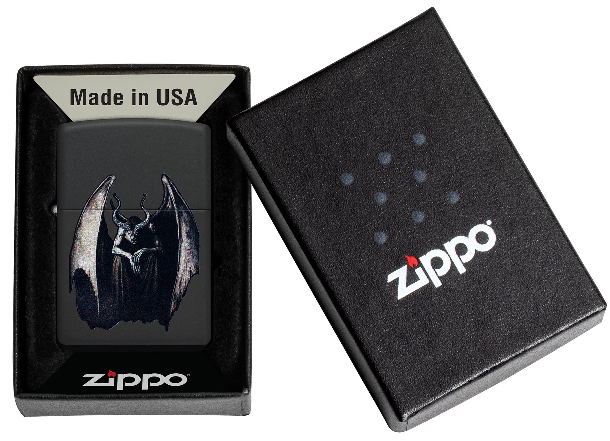 With frightening horns and massive wings, an otherworldly monster poses on the surface of this classic Black Matte lighter in an eerie Color Image design.