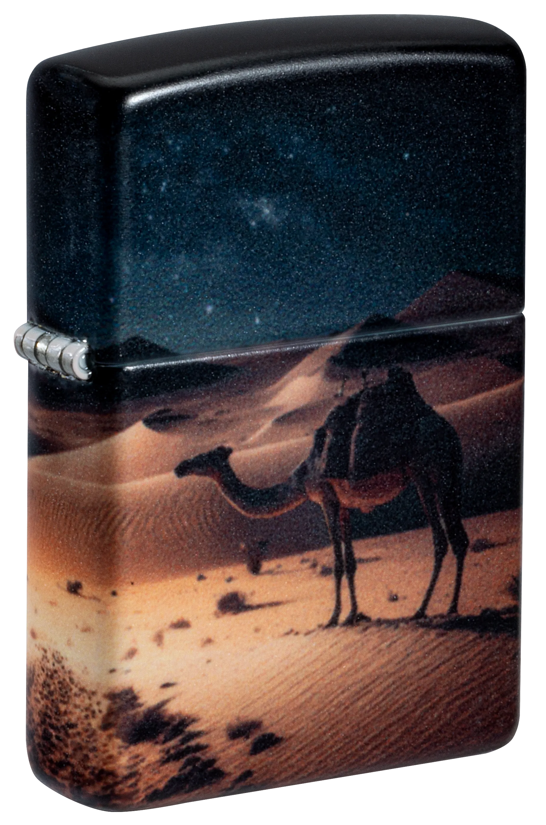 A camel stands stoically in the forefront of a barren desert landscape while its companion admires the cosmos in a stunning 540 Color design.