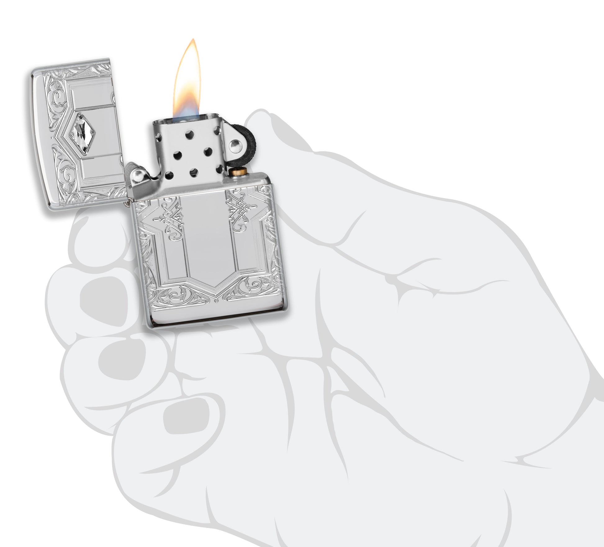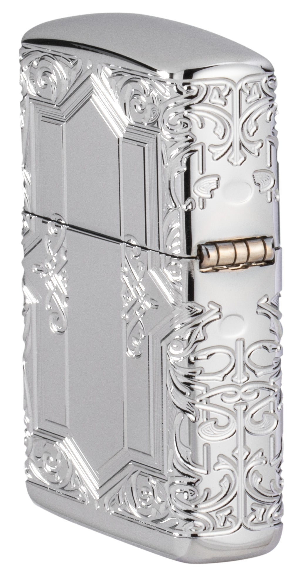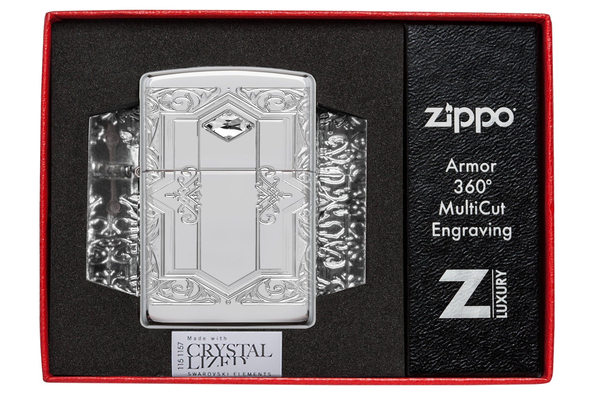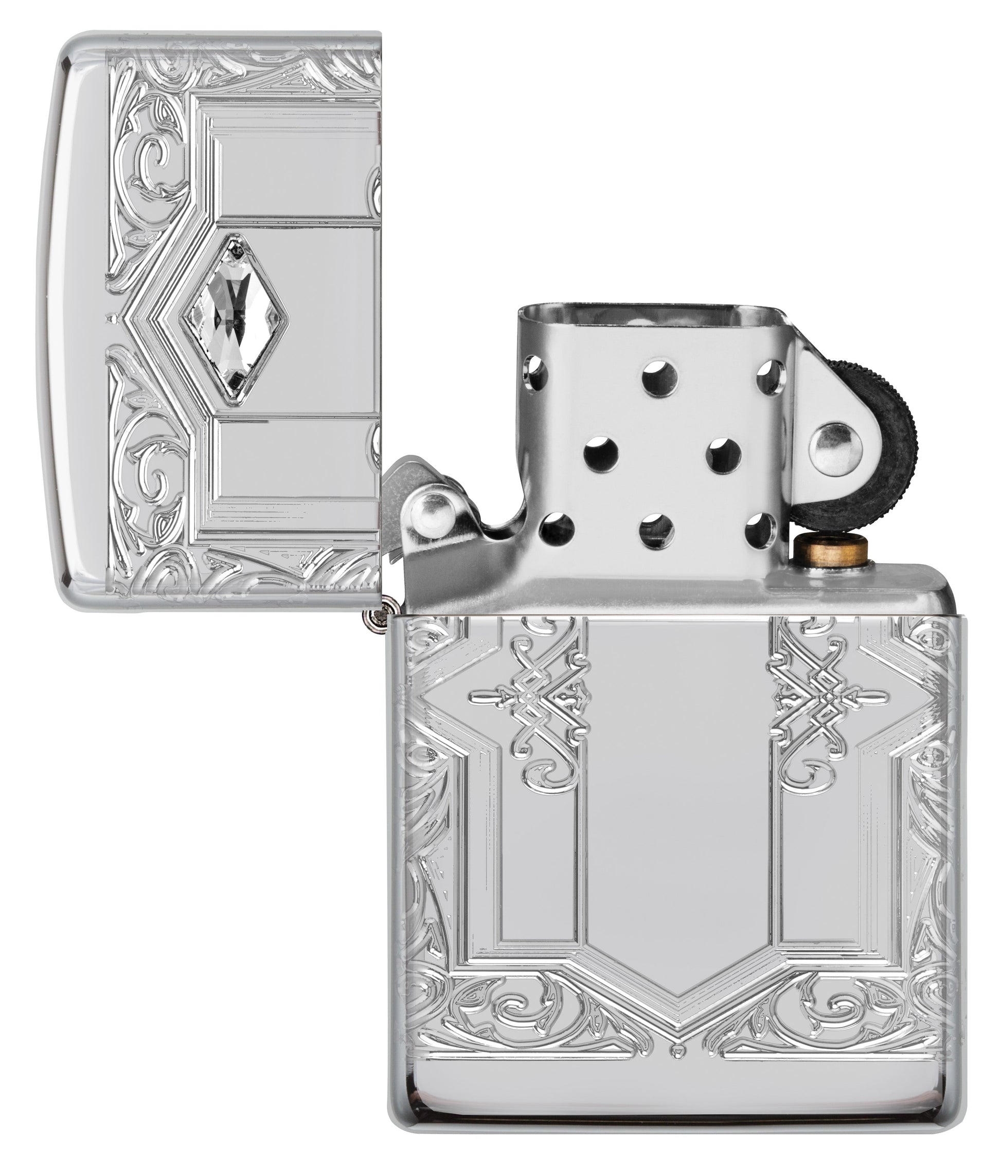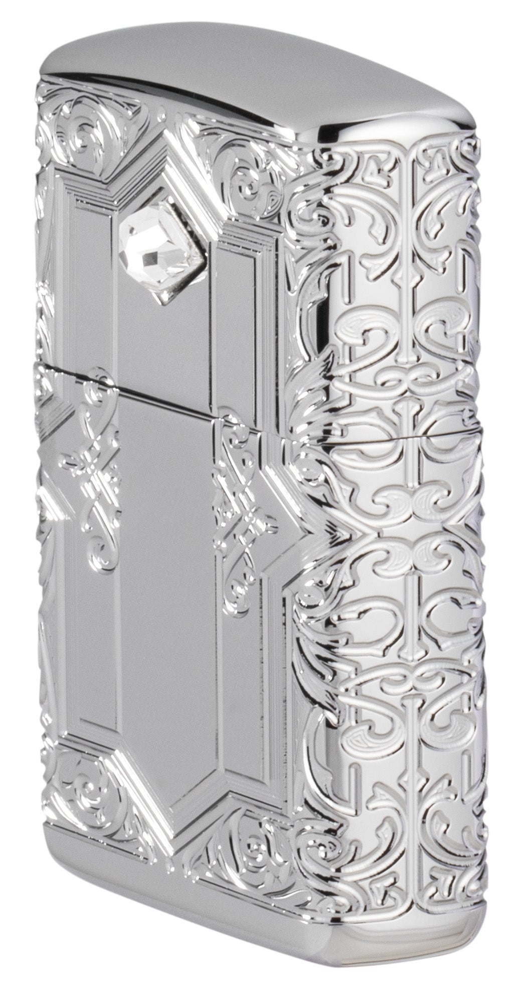 Dieses Armor® High Polish Chrome Feuerzeug ist von allen Seiten mit einem königlichen Muster und schillernden Kristallen verziert, die in unserem MultiCut Verfahren hergestellt wurden.