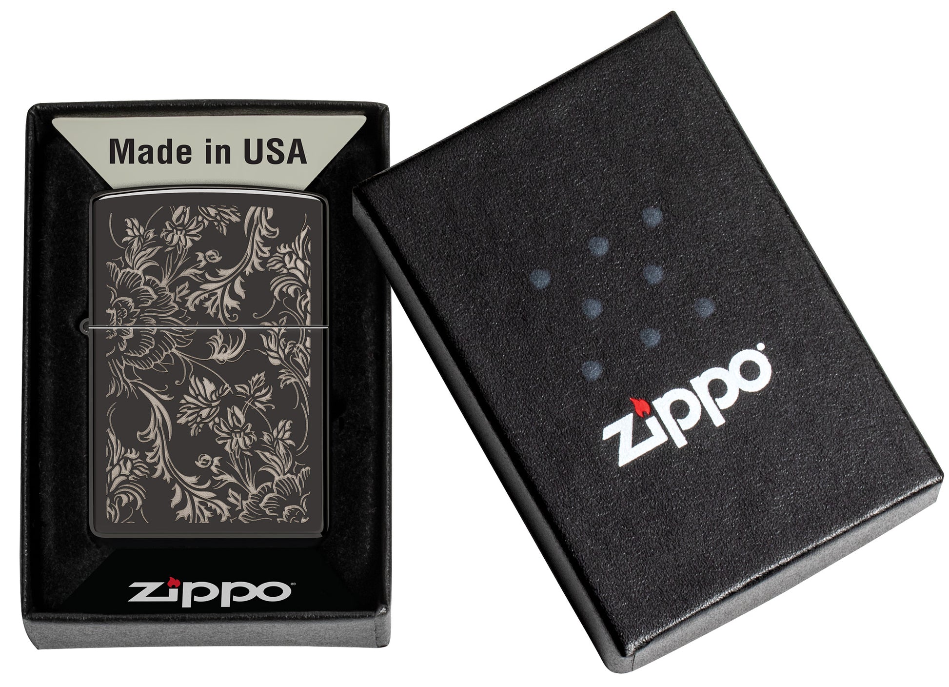 Add a timeless flourish to your collection with this classic High Polish Black lighter. Elegant florals swirl across the surface of the piece in an intricate Laser Engrave design.