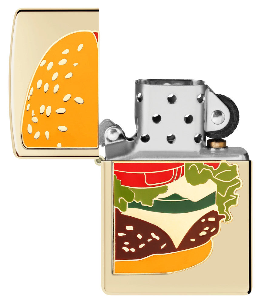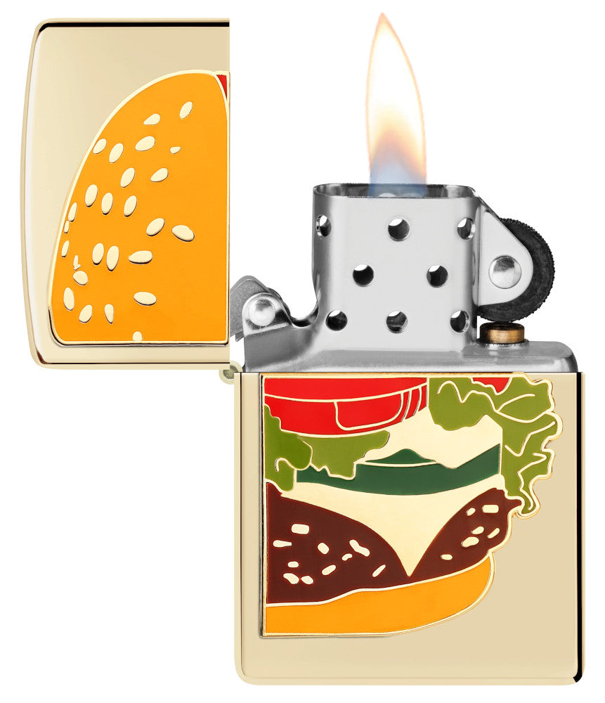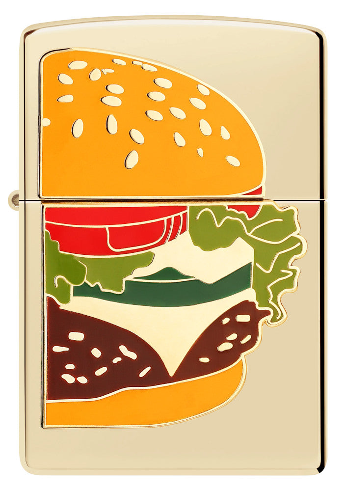 Take the barbecue anywhere with this classic Champagne lighter. A delicious hamburger appears fresh from the grill with all your favourite toppings in a vibrant metal and enamel emblem.