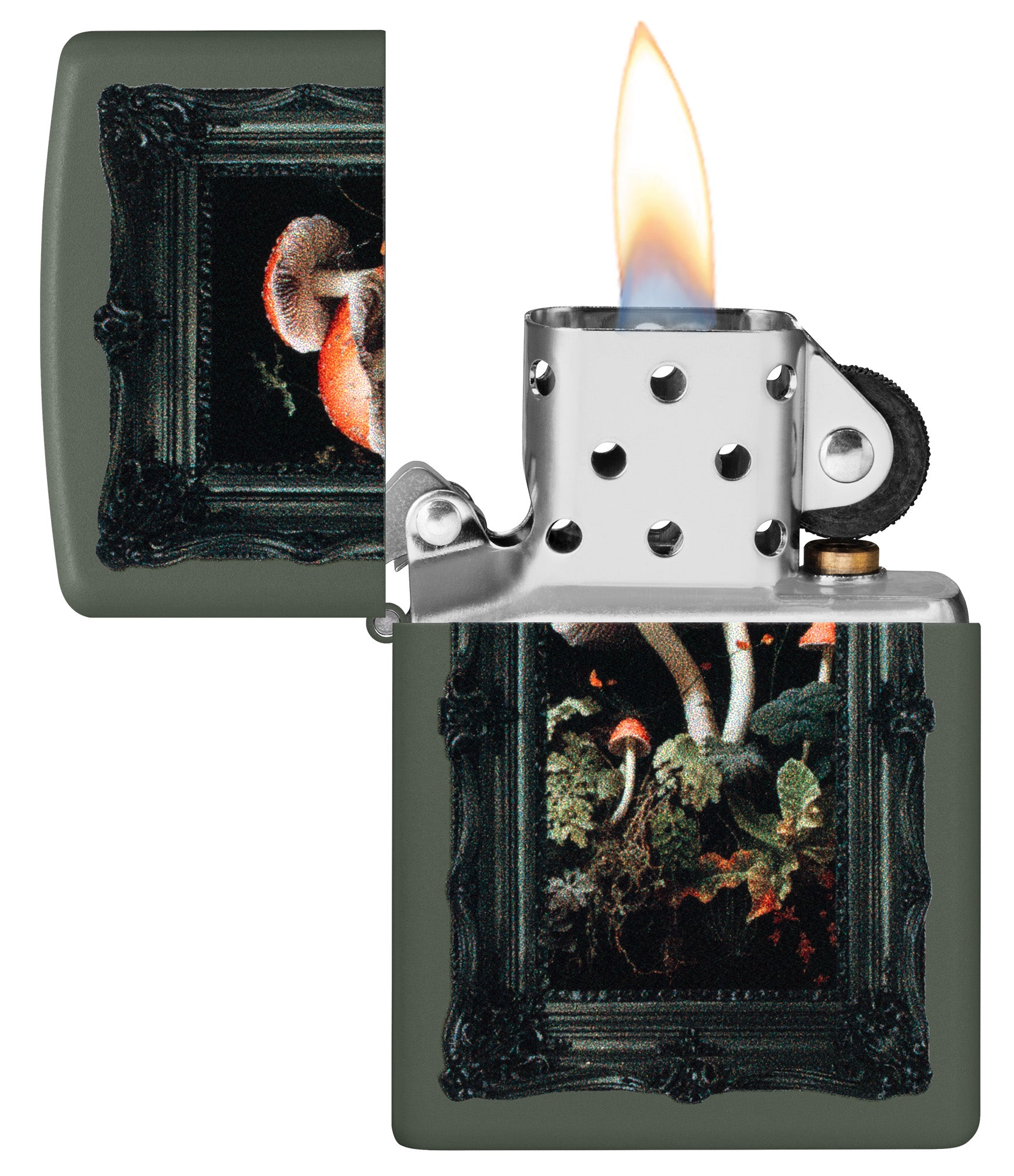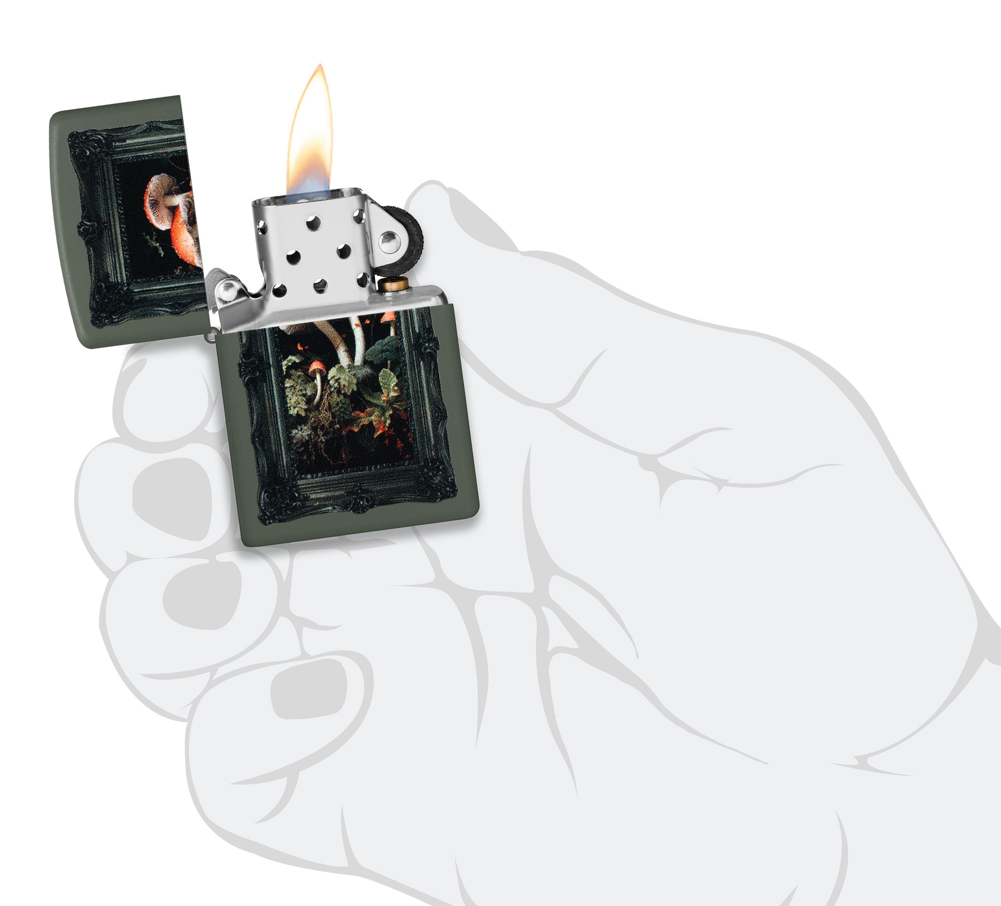 A magical portrait of vibrant mushrooms adorns this classic Green Matte lighter in a whimsical Color Image design.