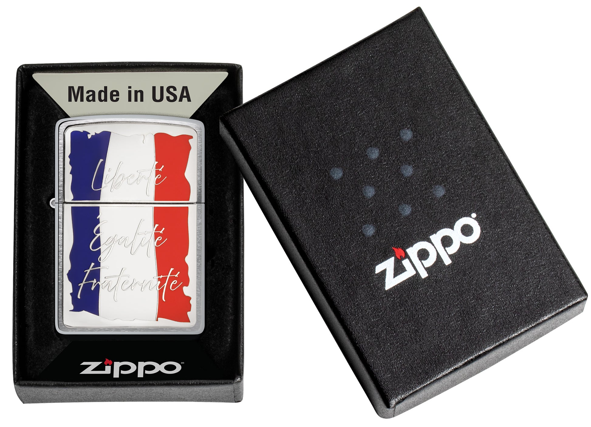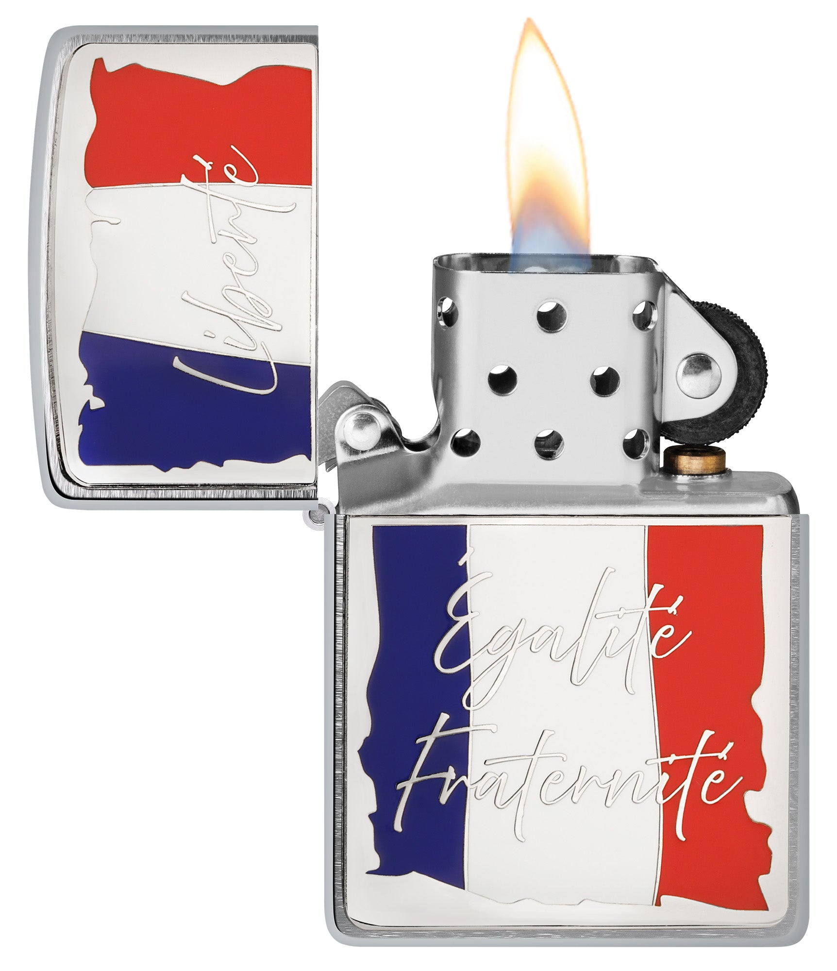 Embrace the spirit of the French with this classic Brushed Chrome lighter. The attached metallic emblem depicts the French flag behind the country's motto: "Liberté, Egalité, Fraternité".