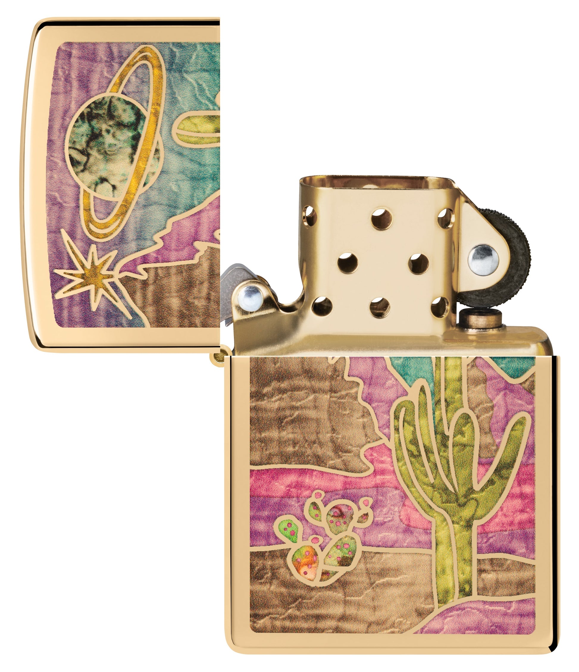 Vibrant cacti spring from the surface of this High Polish Brass lighter in a mesmerizing Fusion design.