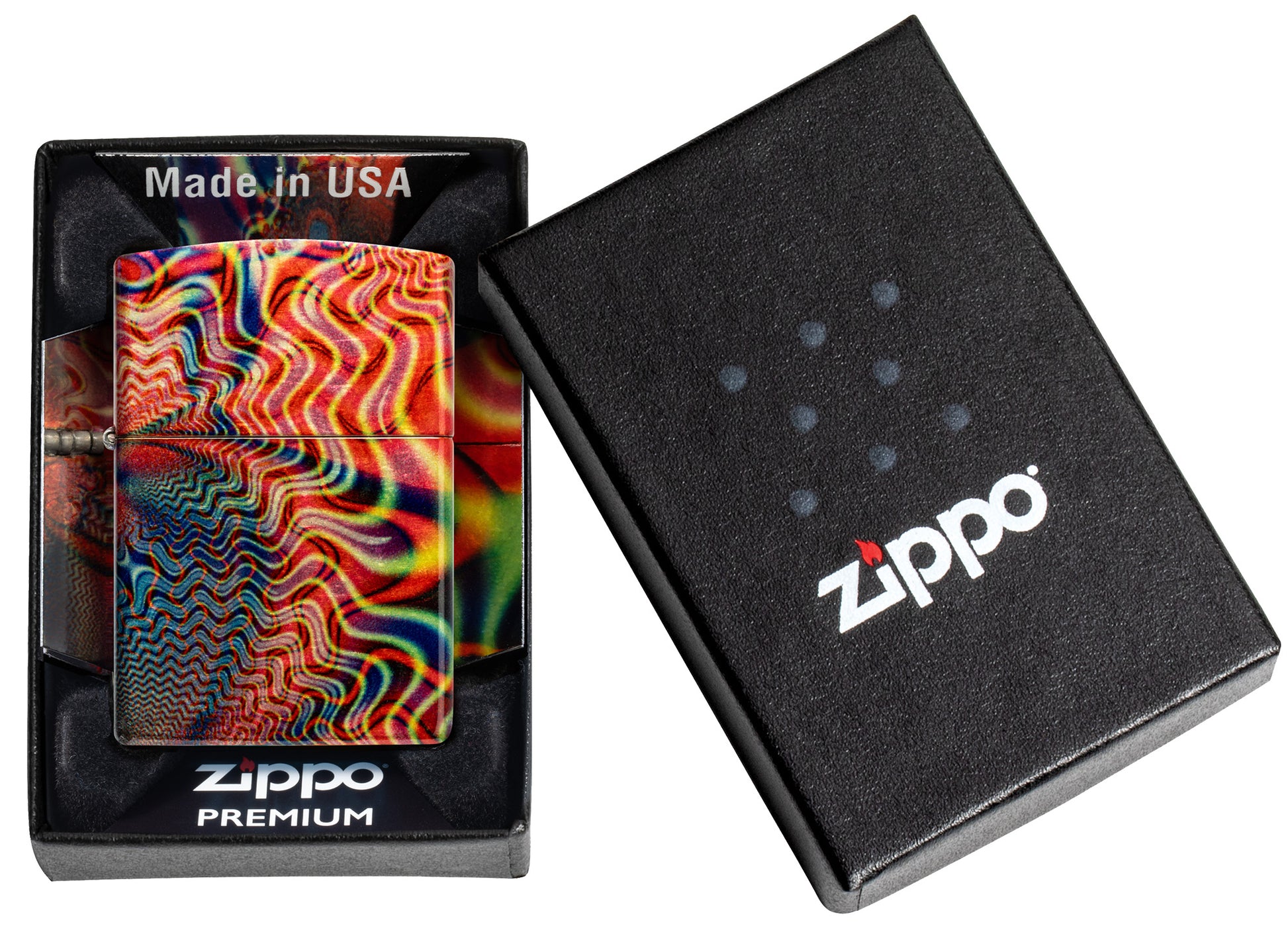 Complemented by the shimmering brass tones of the lighter's case, a rippling sea of colourful waves radiates seamlessly around every surface of this classic Tumbled Brass lighter in a mesmerizing 540 Fusion design.