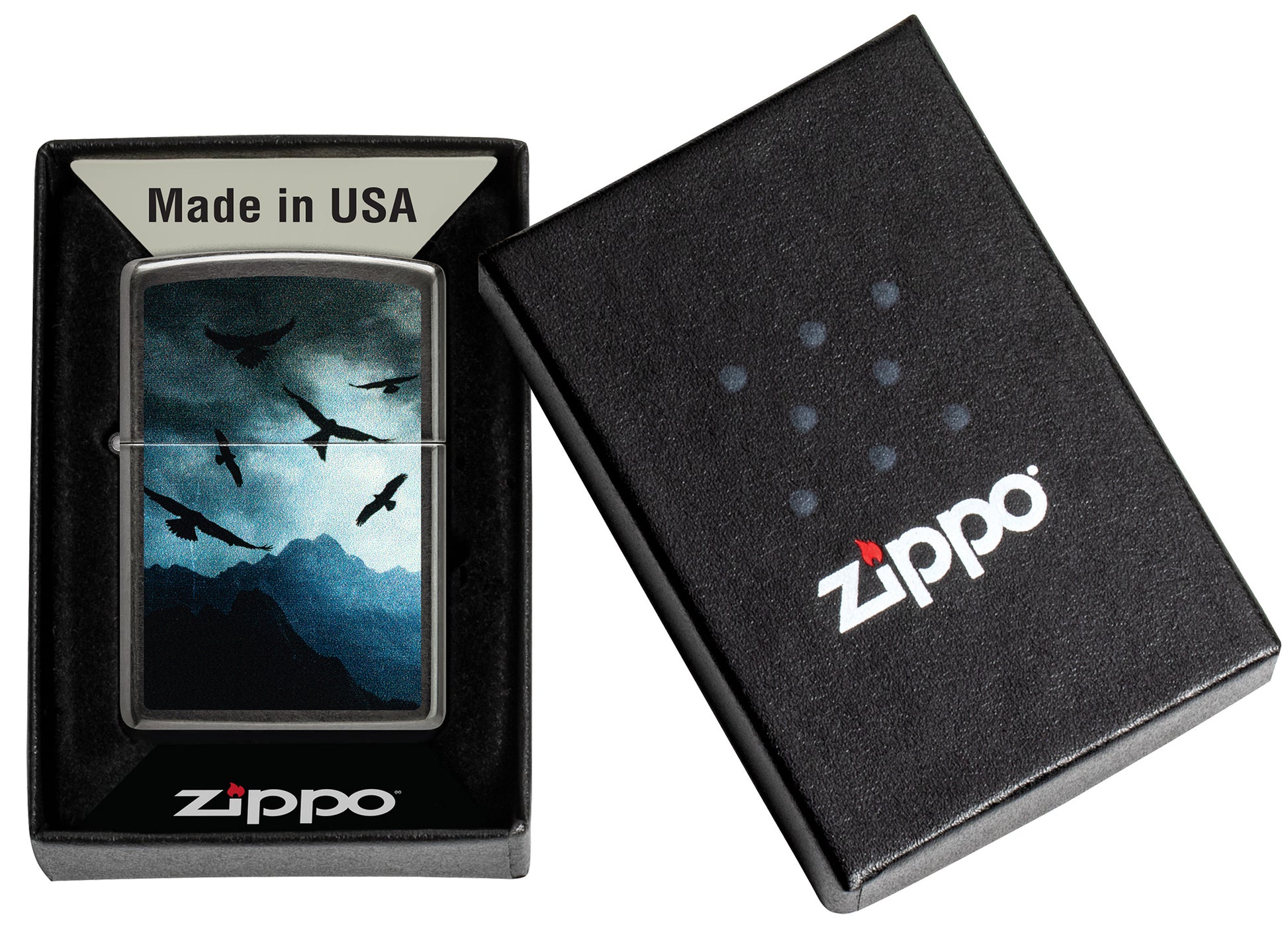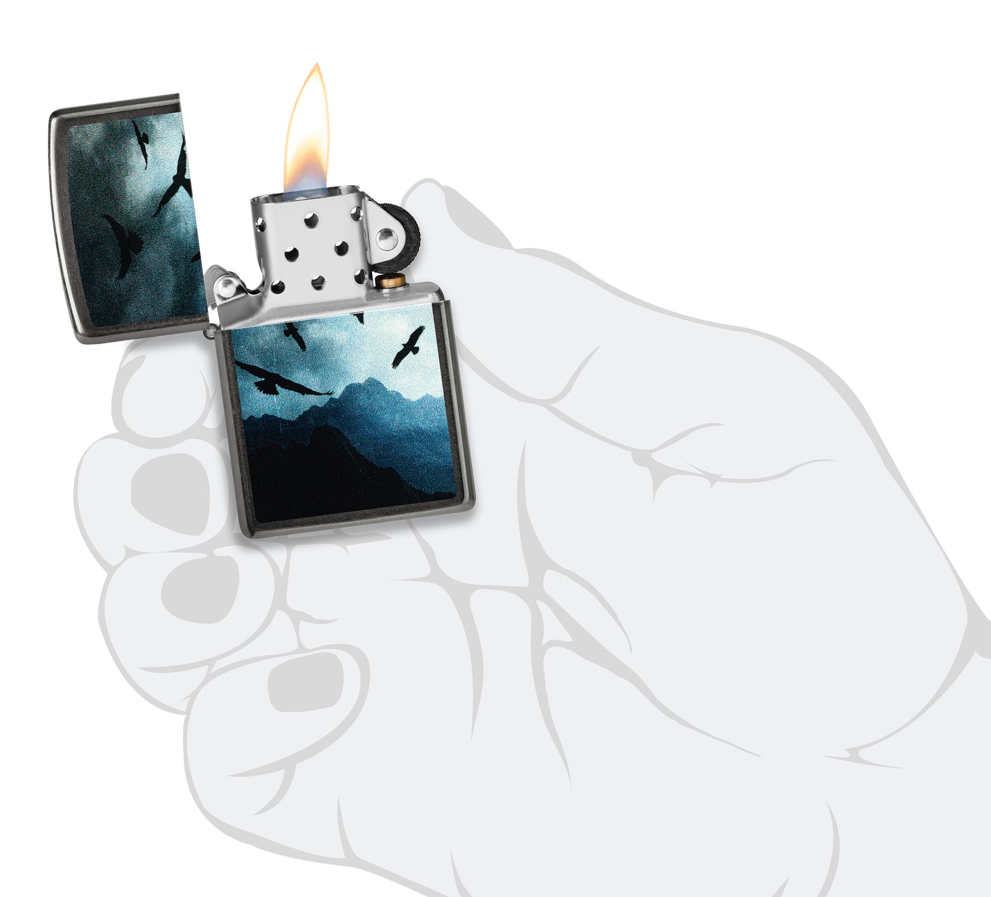A flock of hawks takes flight over a cloudy mountain landscape on this classic Grey lighter in a serene Color Image design.