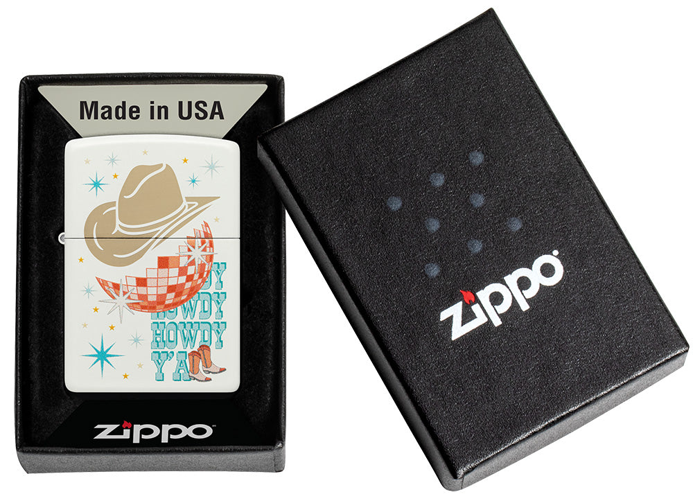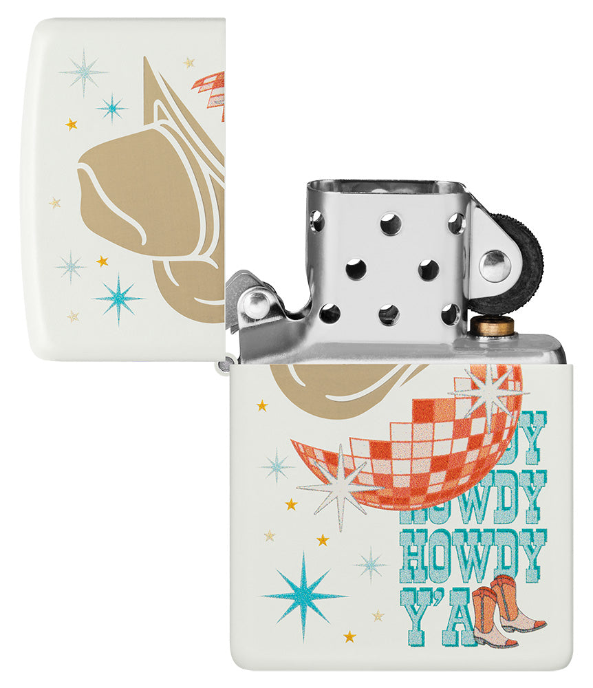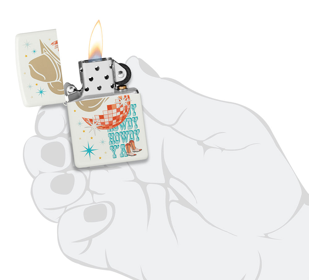 This classic White Matte lighter is ready for a good time. A new pair of boots, a crisp new hat and a dazzling disco ball appear in a Color Image and Laser Engrave design, so you can bring the rodeo with you wherever you roam.