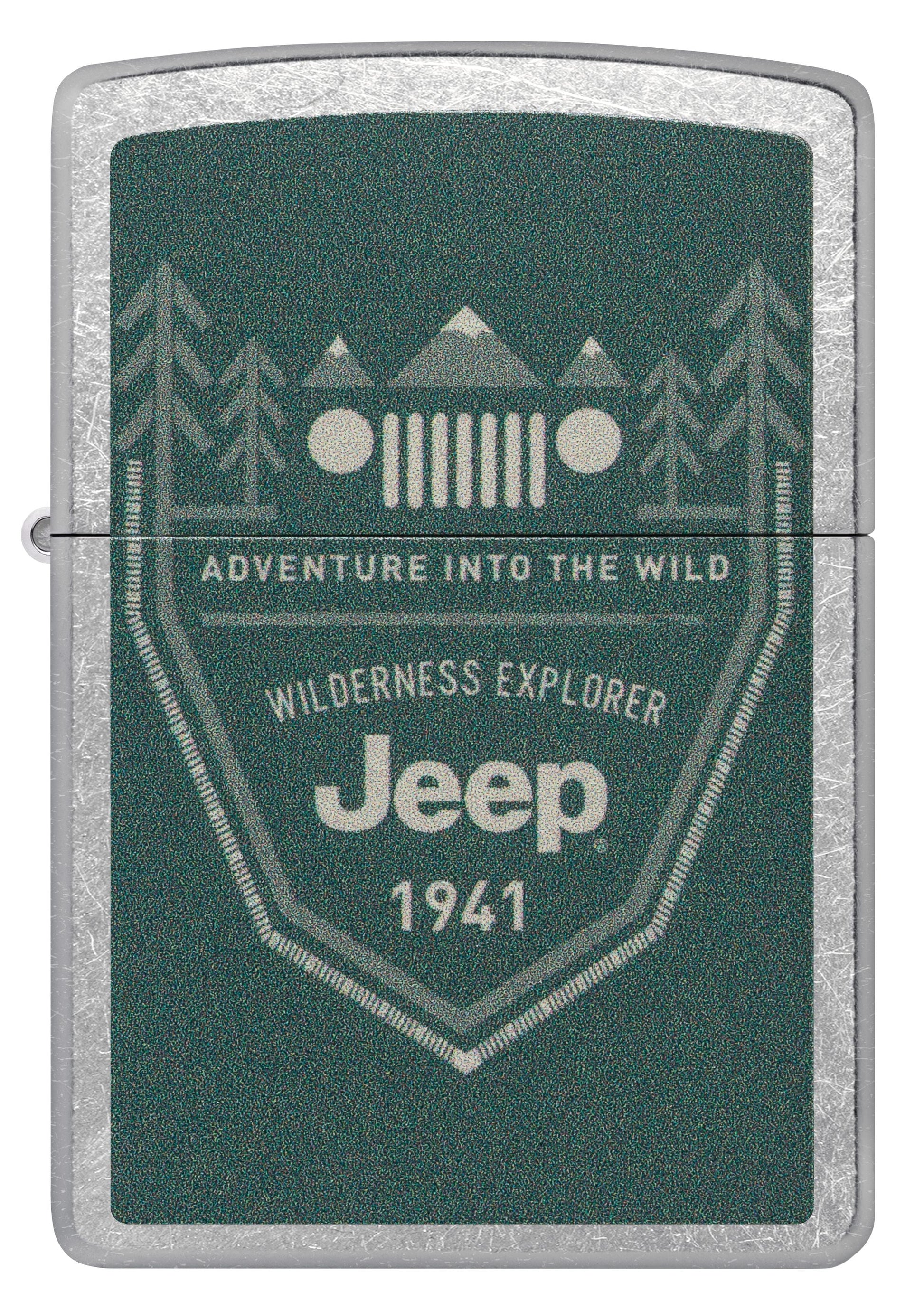 Adventure into the wild with this classic Street Chrome lighter. The minimalist Color Image design depicts the iconic Jeep grill among a forest-green wilderness and is anchored by Jeep's logo and founding year.