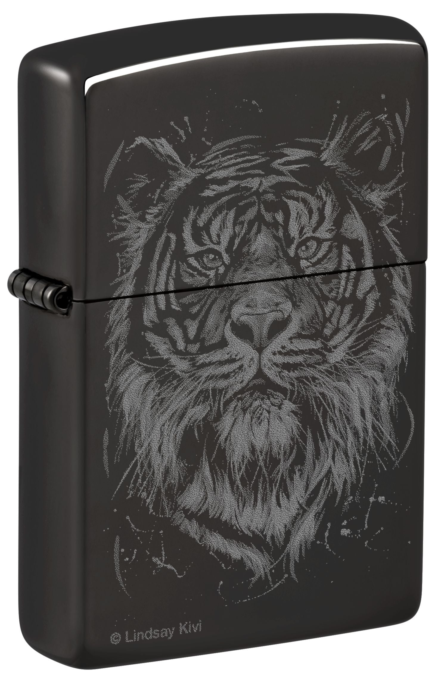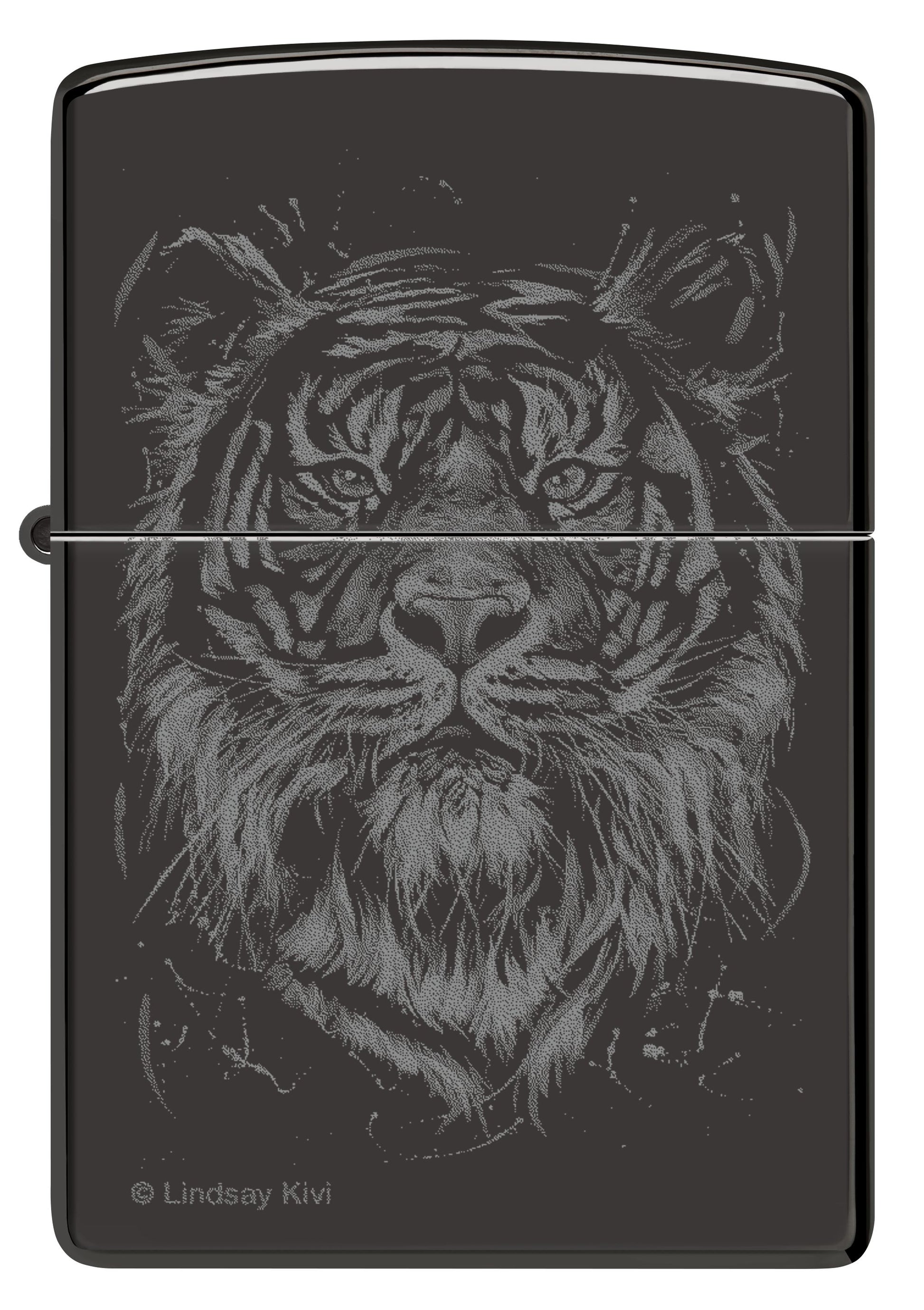 Specializing in animal portraiture, artist and environmentalist Lindsay Kivi uses her art to affirm our intrinsic link to nature and inspires her audiences to deepen their connection to all living beings. Her piece, The Big Cat, emerges from this classic High Polish Black lighter in a smoky Photo Image design.