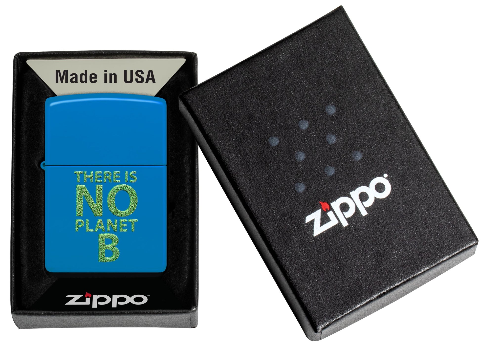 This Sky Blue Matte lighter serves as a reminder to protect our one and only planet Earth. The Texture Print design reads, "There is no planet B," in three-dimensional text.