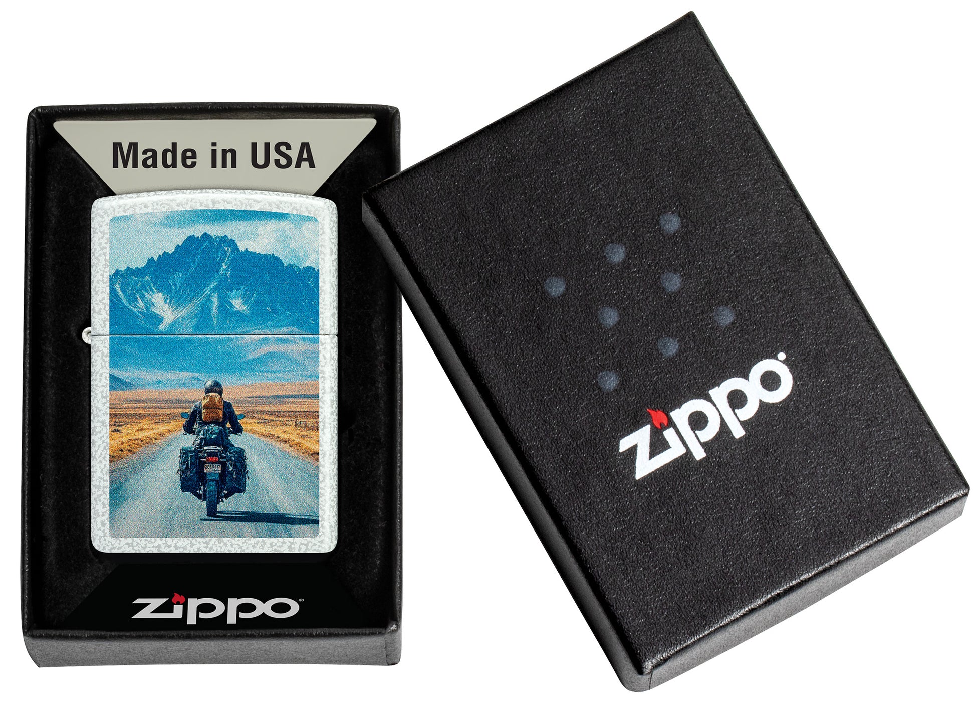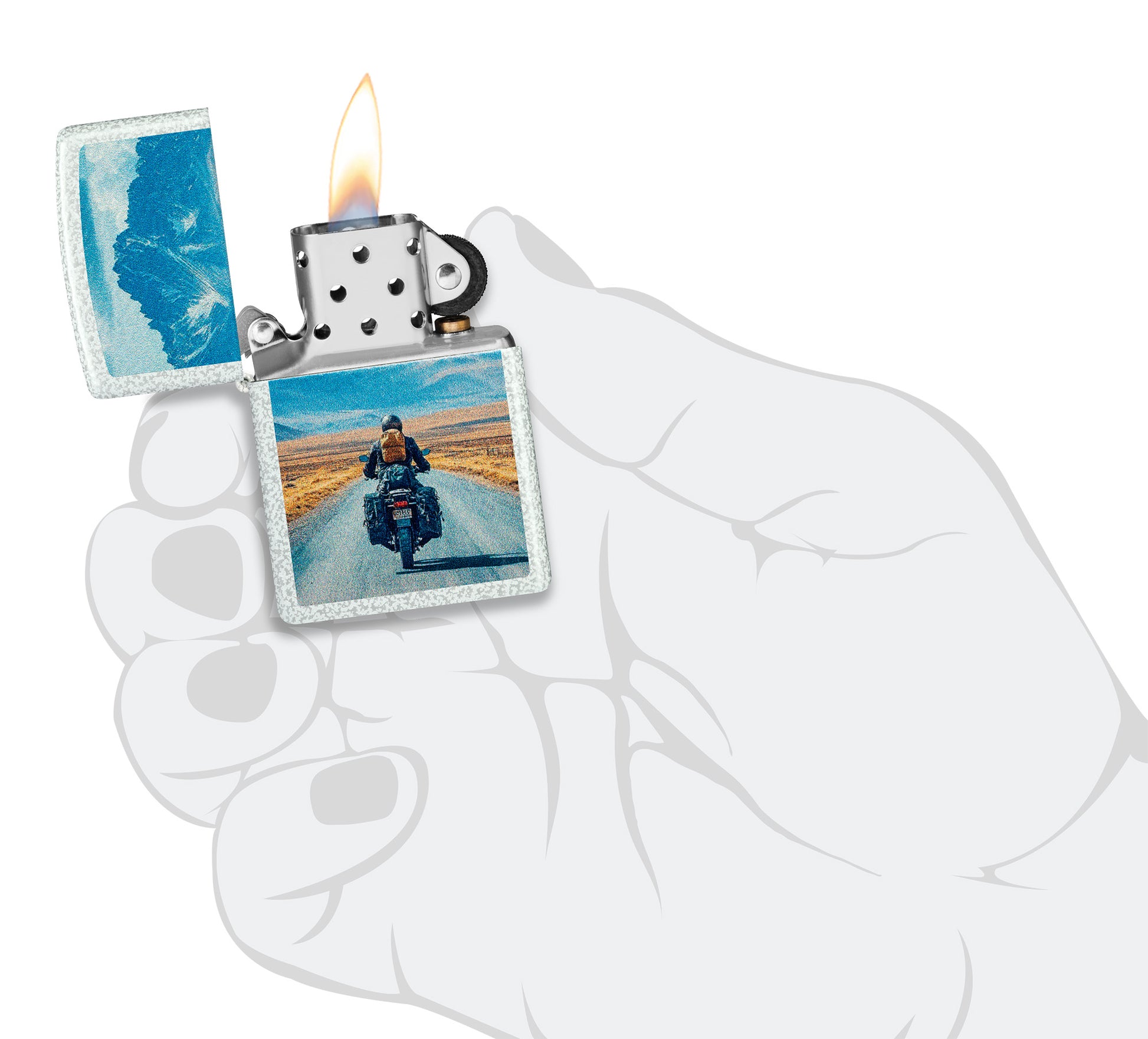 Let this classic Glacier lighter accompany you on your next road trip. The vibrant Color Image design depicts a motorcycle speeding along a captivating mountain road.