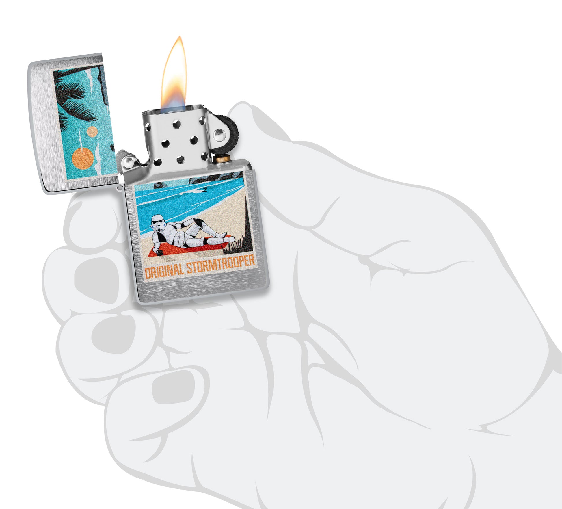 Perhaps the most recognisable fighting force in the galaxy, the iconic Original Stormtrooper is right at home on this classic Brushed Chrome lighter. The bold Color Image design depicts a beloved Stormtrooper lounging on the beach.