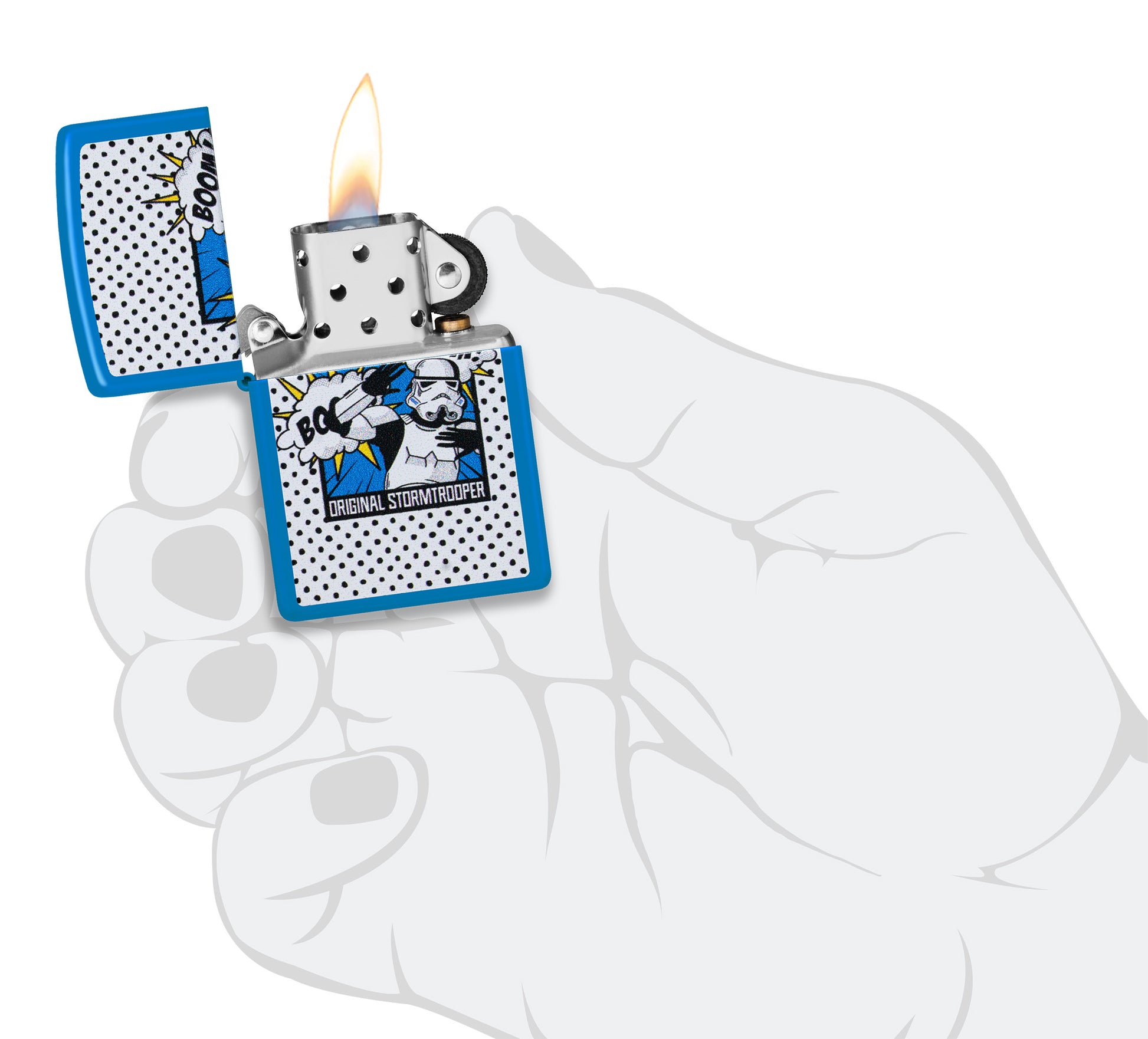 In this design from Original Stormtrooper, one beloved soldier dodges blasts on the surface of this classic Sky Blue Matte lighter in a comic-inspired Color Image design.