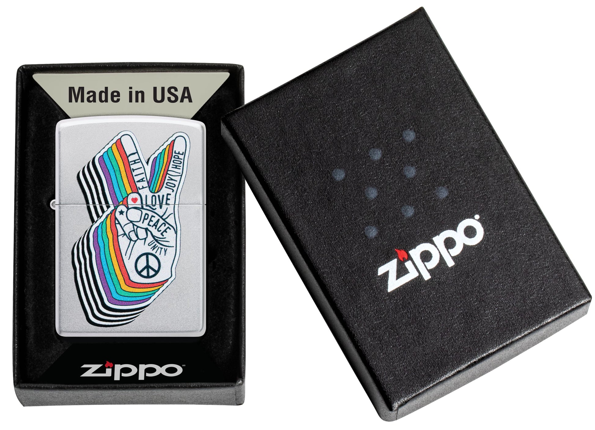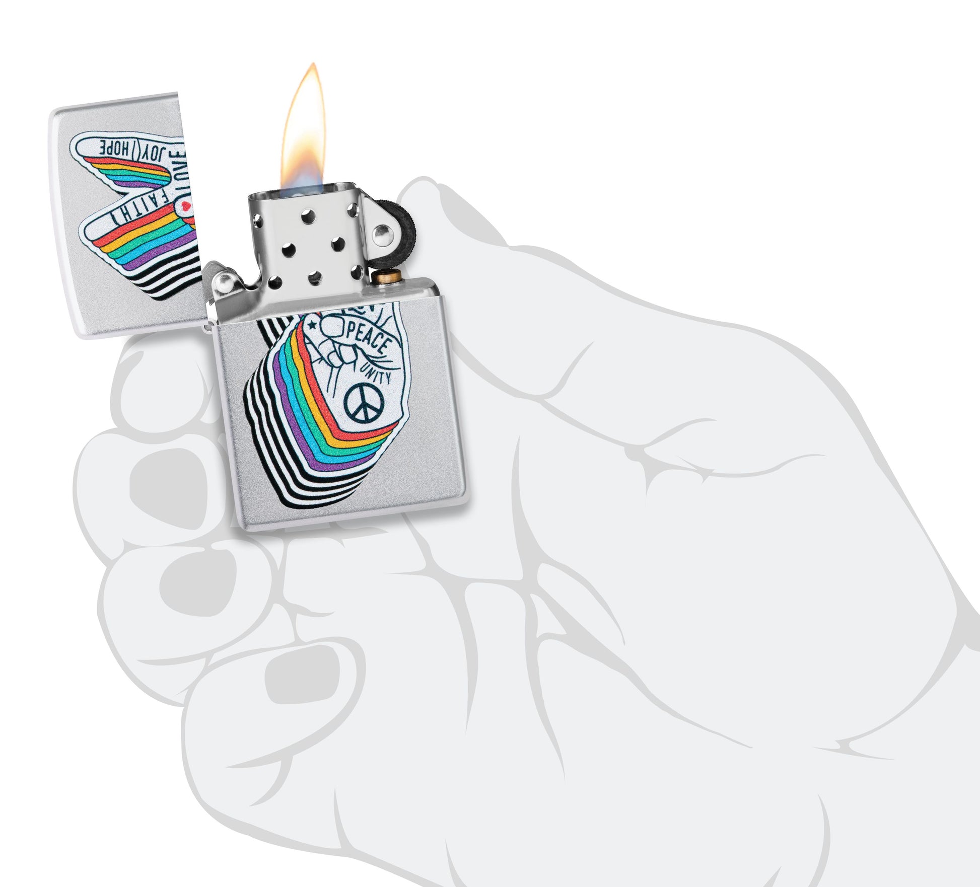 Peace and love radiate from this classic Satin Chrome lighter. The Color Image design features a multicolor "peace" signal inscribed with "faith," "joy," "hope," "love," "unity" and, of course, "peace."