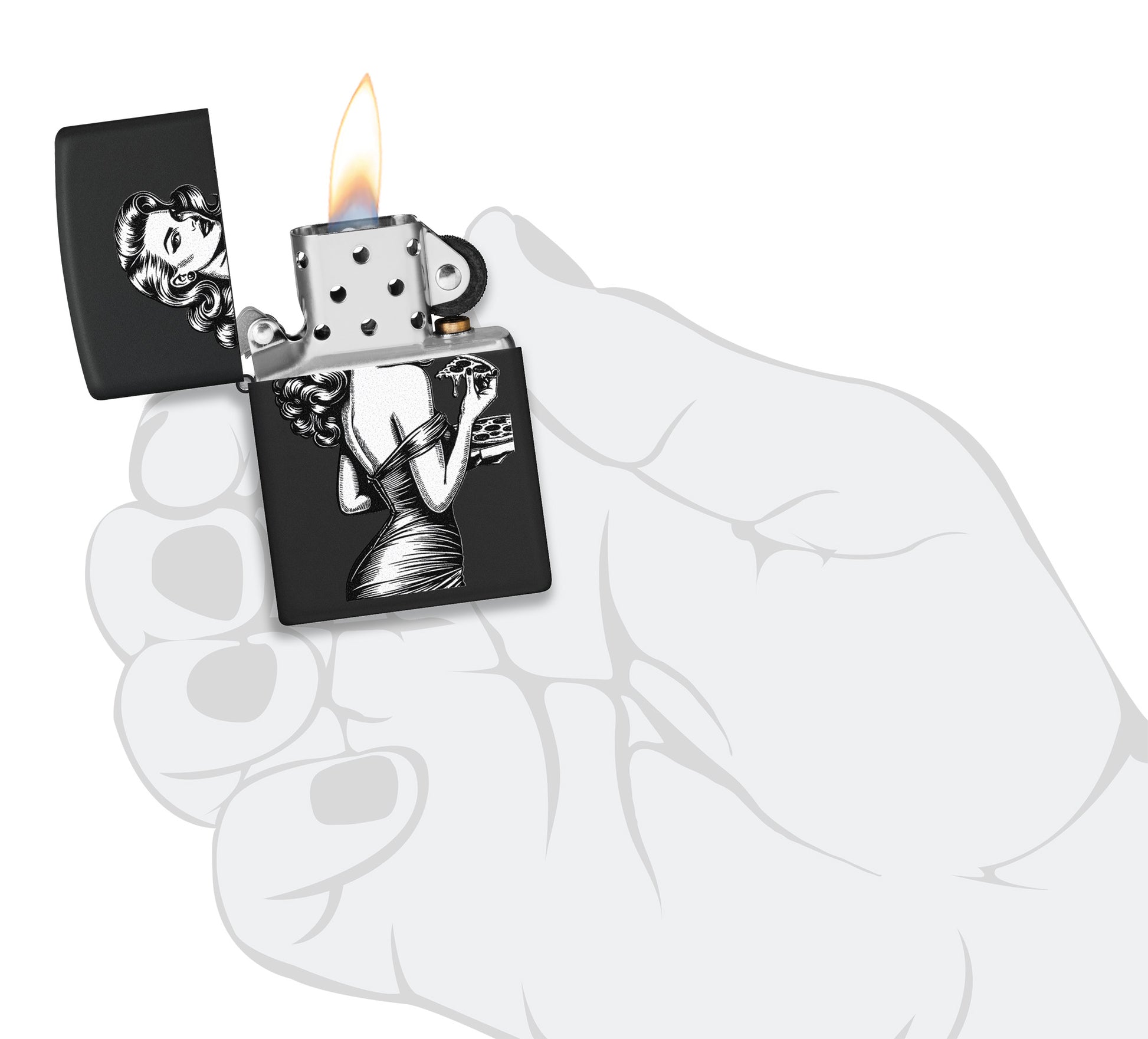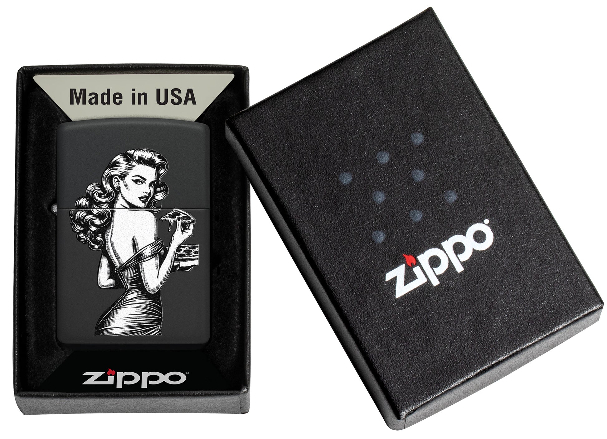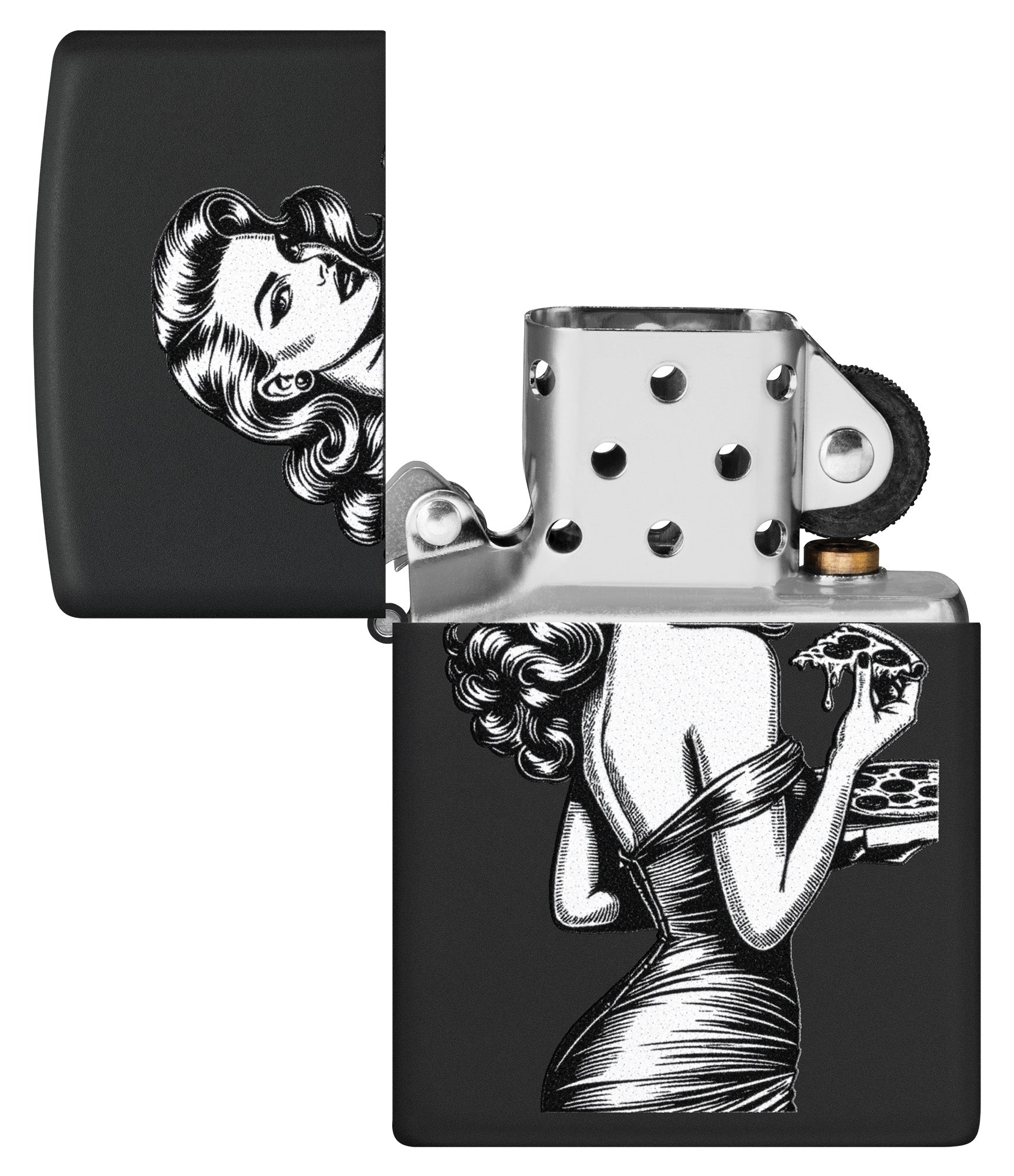 A gorgeous pinup model poses with a delicious slice of pizza on this classic Black Matte lighter in a vintage-inspired Color Image design.