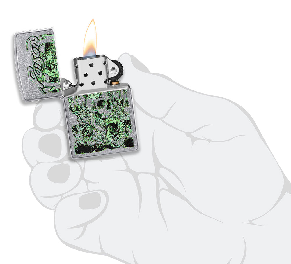 The Street Chrome finish gives the lighter a robust yet modern look. The colourful motif with the snake winding through the skull creates a captivating contrast and gives the lighter a mysterious aesthetic.