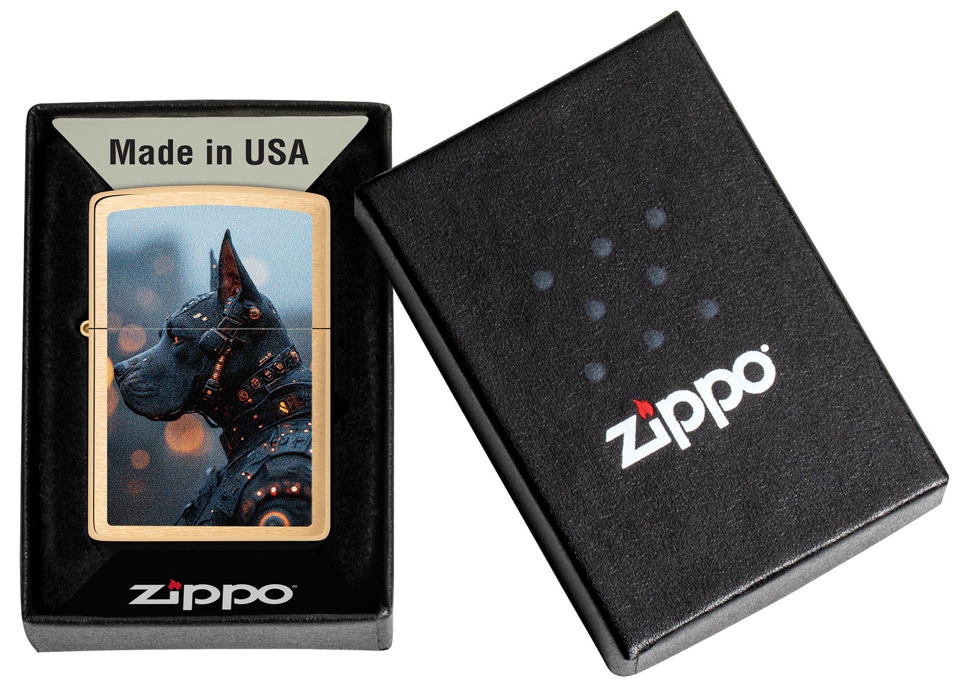 This classic Brushed Brass lighter features a mechanical canine in a futuristic Color Image design.