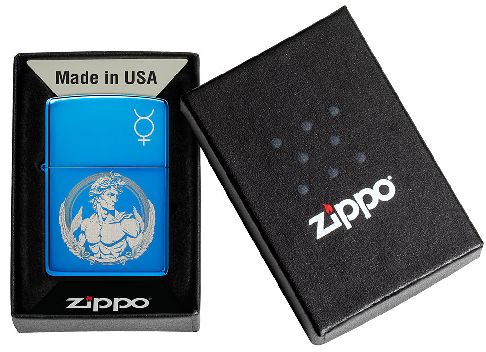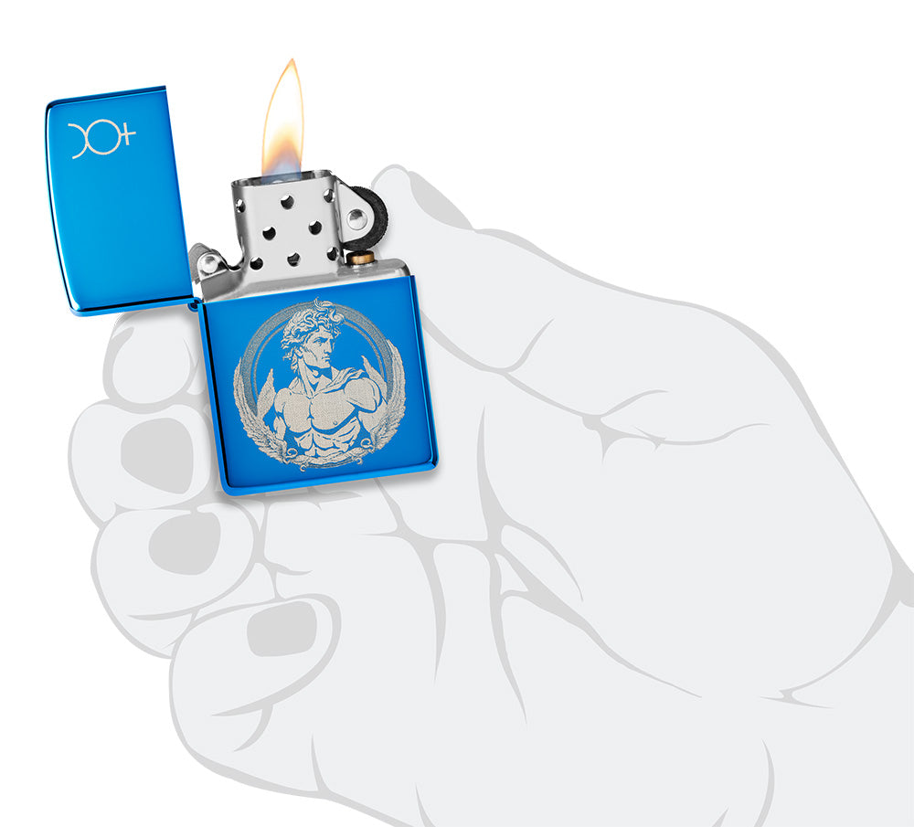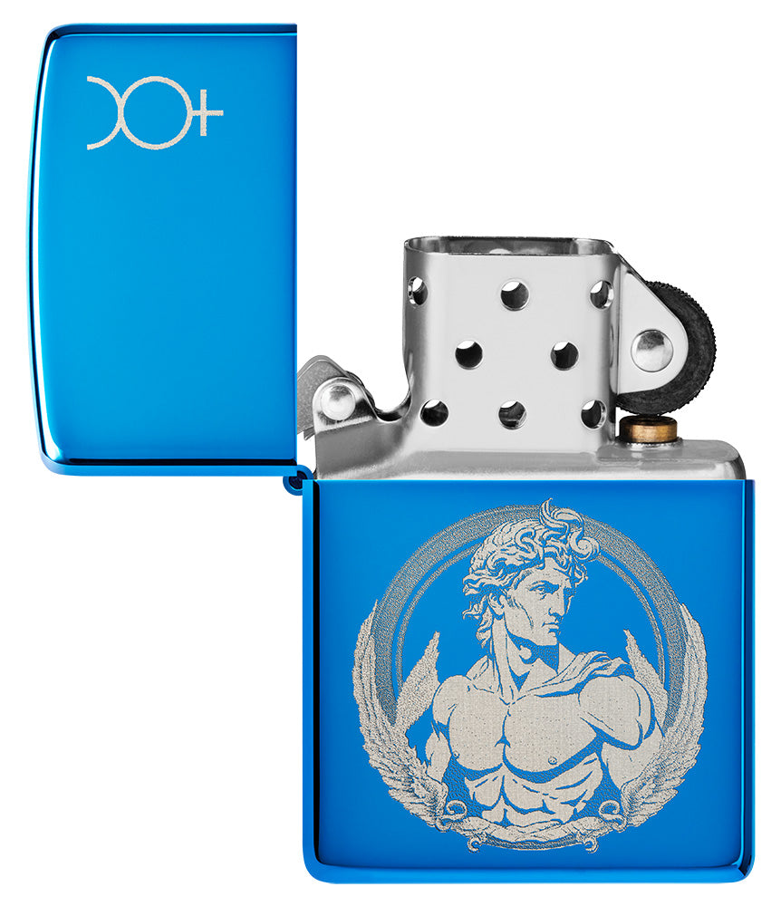 Mercury, the Roman god of commerce, communication and travelers, commands in brilliant, stoic detail on the surface of this classic High Polish Blue lighter in an intricate Photo Image design.