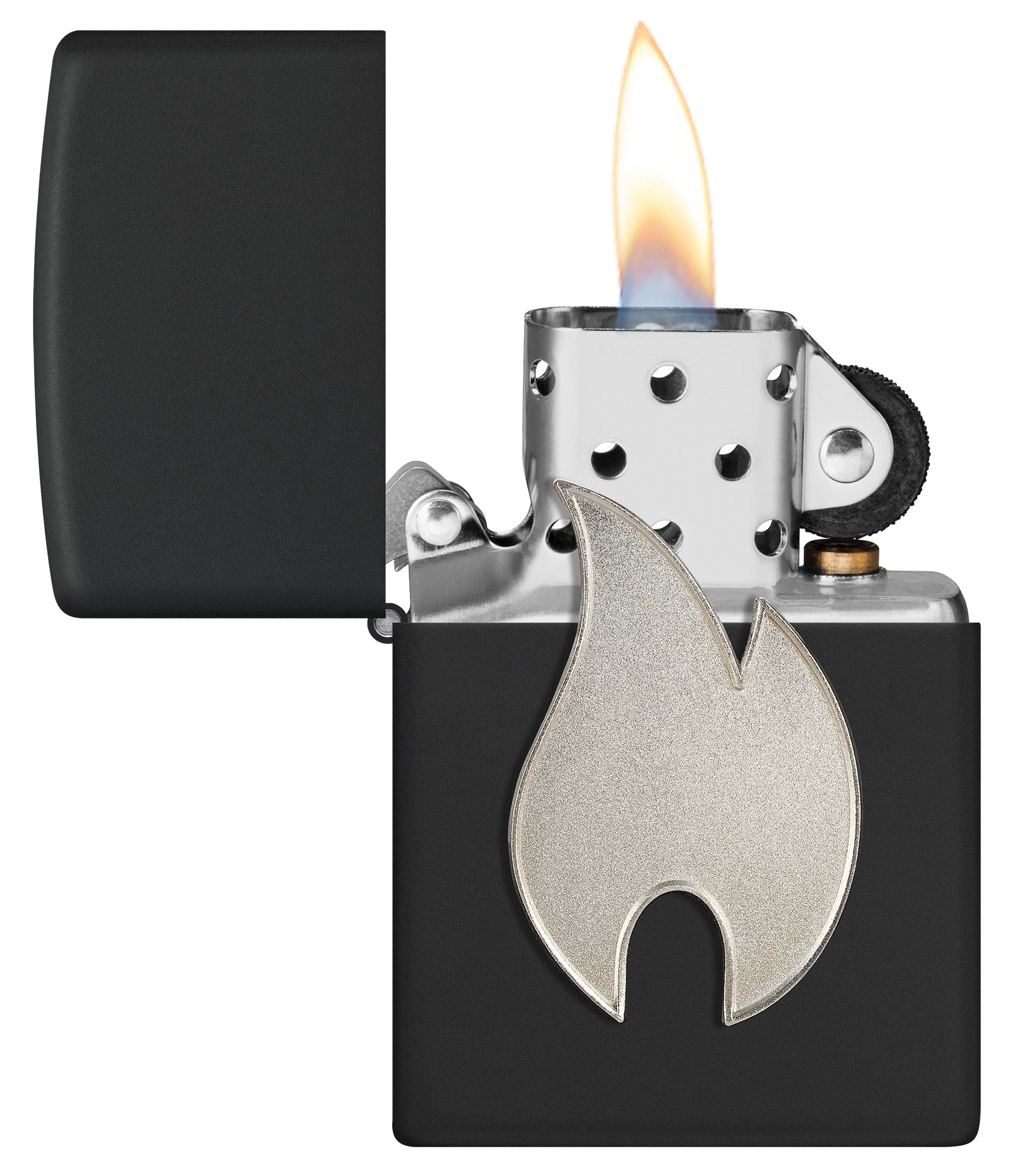 This classic Black Matte lighter features the Zippo flame icon on a bright silver metallic emblem, which stays in place when the lighter is opened.