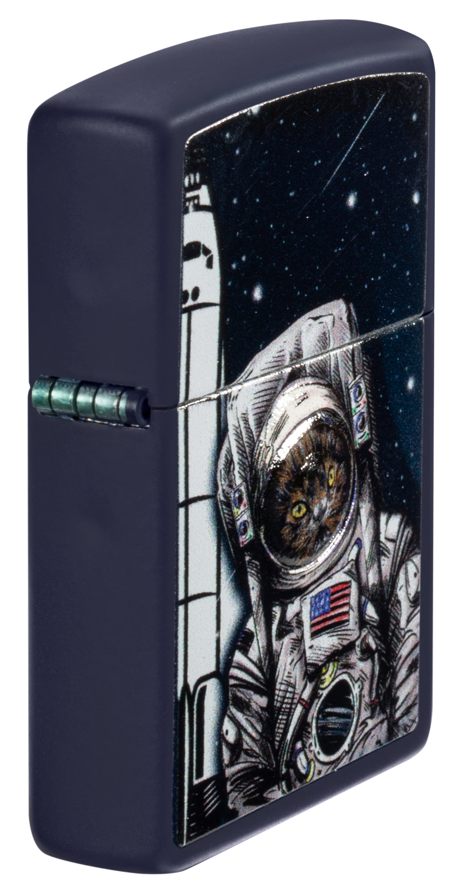 Greetings from outer space! This classic Navy Matte lighter features an intrepid feline astronaut on an intergalactic mission, made with our color image and texture printing process.