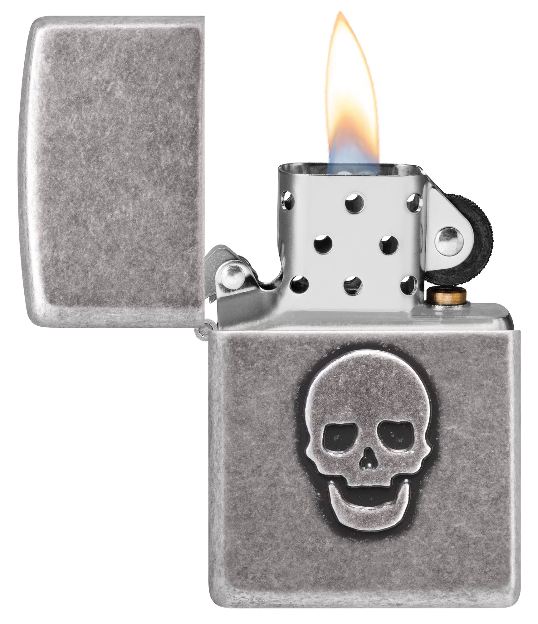 A simple skull is stamped into the surface of this classic Antique Silver lighter, adding subtle depth and texture to the elegant finish.