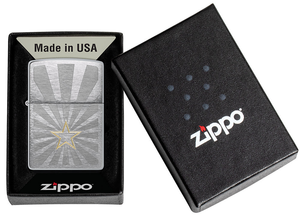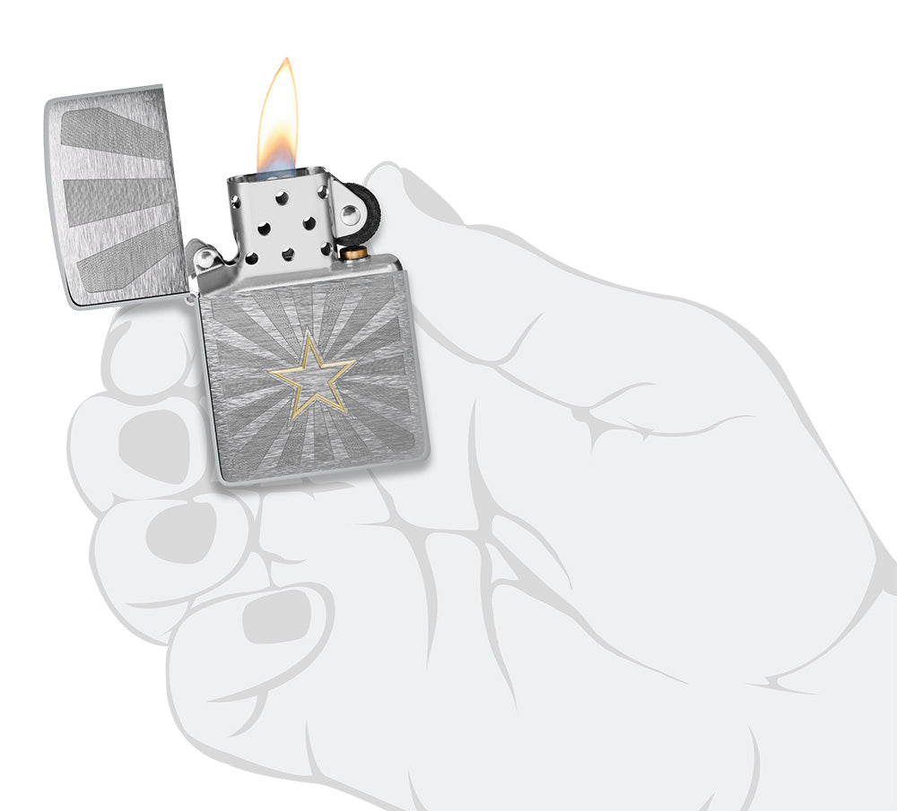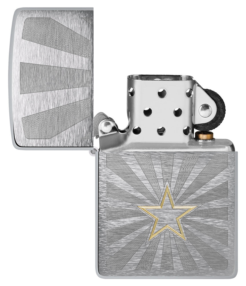 Brilliant beams radiate from the center of this classic Brushed Chrome lighter, where a star shines in glittering brass tones thanks to our Auto Two-Tone process.