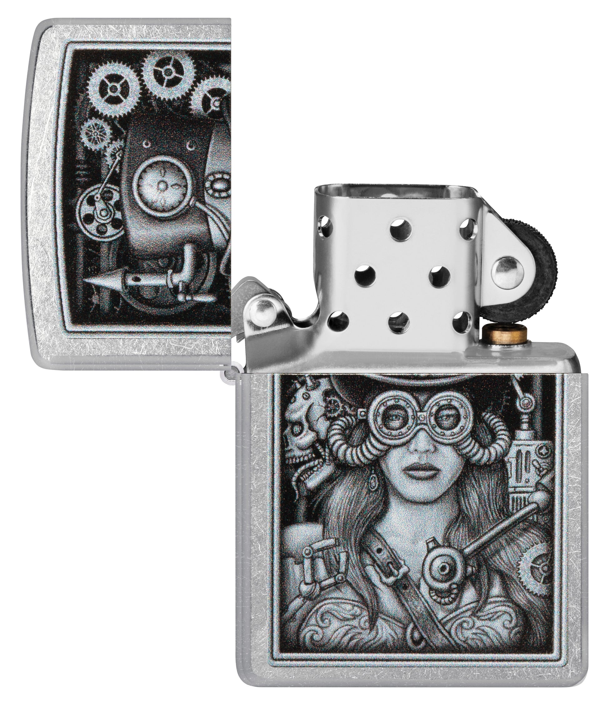 The steampunk-inspired Color Image design on this classic Street Chrome lighter features an aeronaut decked out with all the bells and whistles. Comes packaged in a gift box. For optimal performance fill with Zippo lighter fuel.