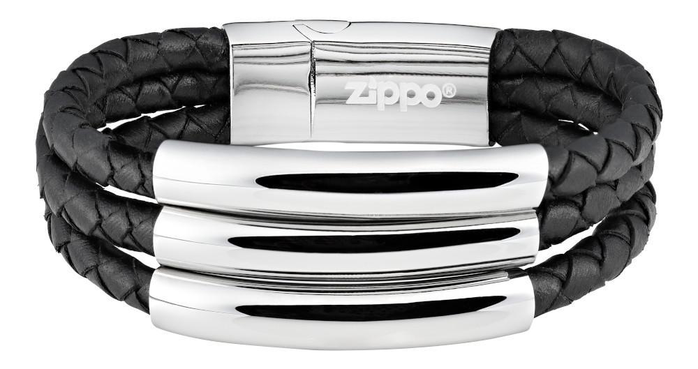 Real leather bracelet consisting of three individual thin leather straps, each of which is decorated by a stainless steel case. The flat clasp of the bracelet has an integrated magnet with each end simply pushed together to secure on your wrist. The inside of the clasp is decorated with the original Zippo logo with the outside featuring the Zippo flame.