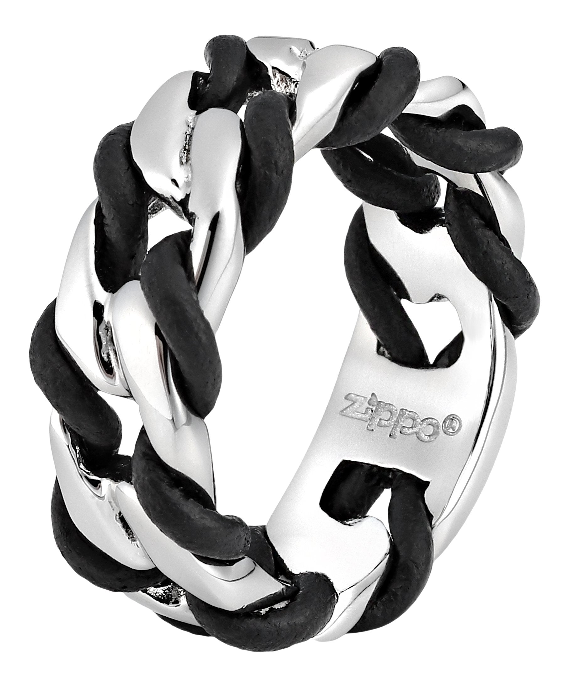 This ring pairs noble stainless steel, and casual leather. The stainless steel elements are pulled through by a thin leather strap. Featuring the Zippo logo on the inside of the ring.