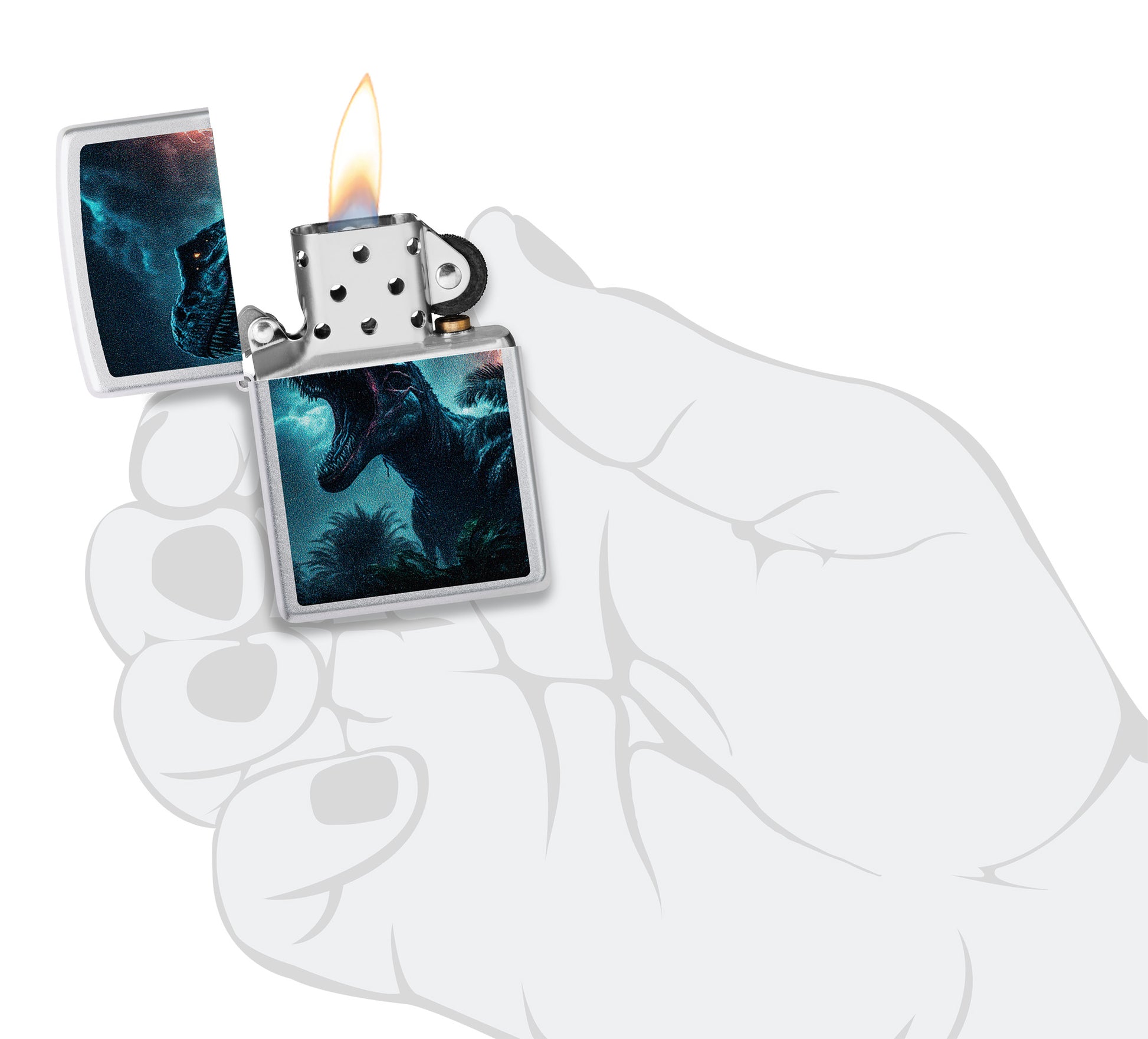 Take a trip to the Jurassic era with this classic Satin Chrome lighter. A ferocious Tyrannosaurus Rex tears through the jungle foliage beneath a stormy sky in the menacing Color Image design.
