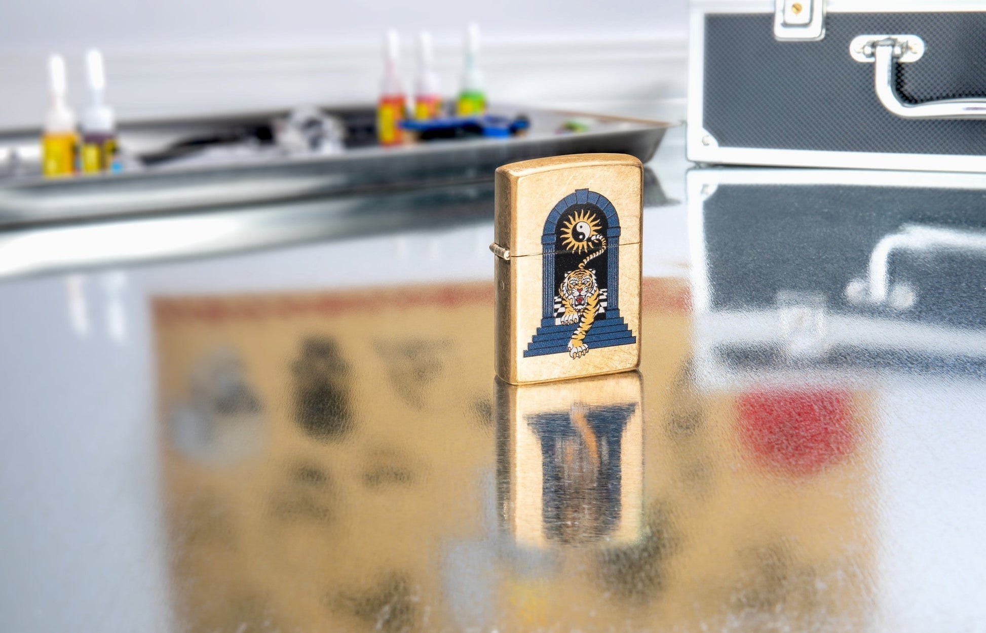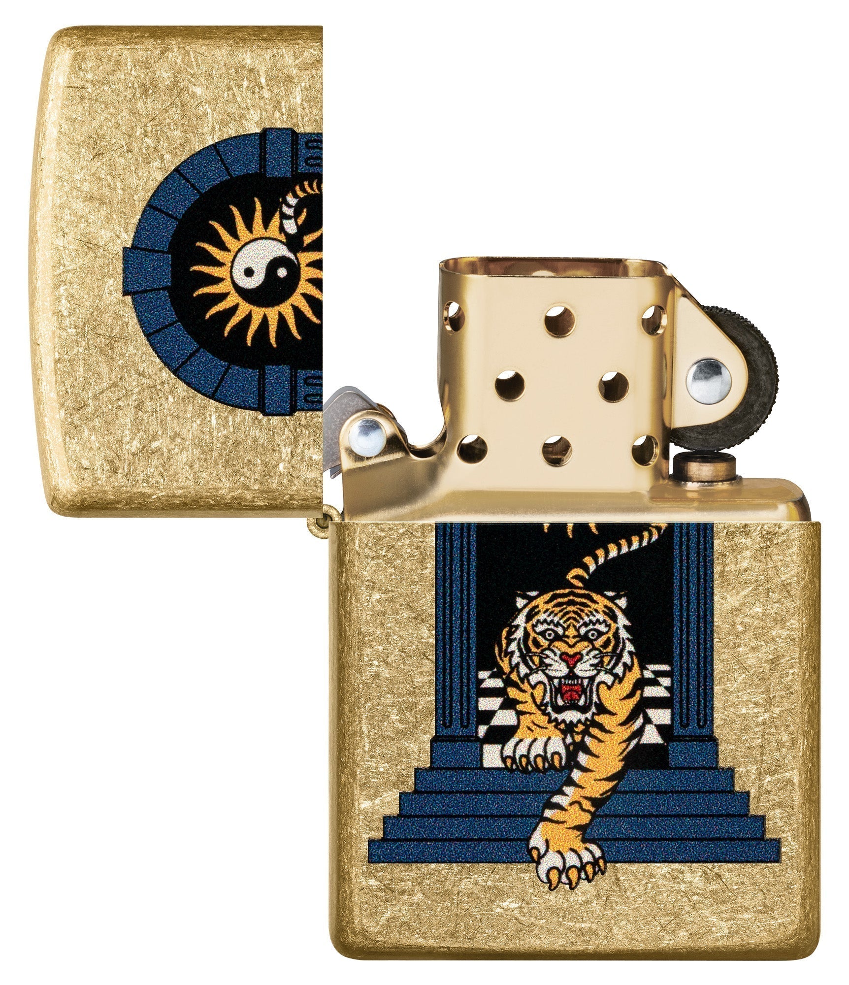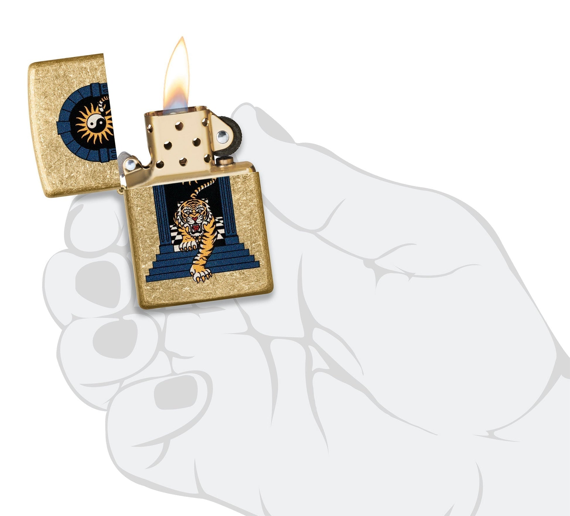 The tumbled brass surface gives the lighter a rustic yet stylish look. The colourful motif of the tiger walking through the gate symbolises strength, courage and freedom. The Yin & Yang symbol in the background refers to the harmony and balance between opposites.