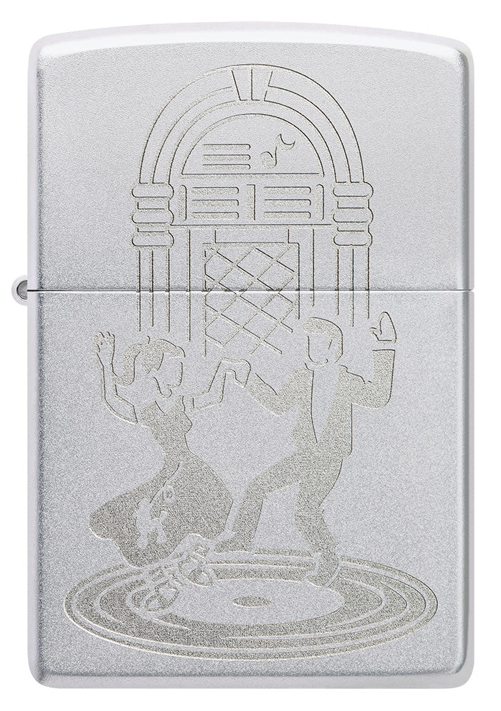 A pair of sweethearts grooves in front of the jukebox on this classic Satin Chrome lighter in a delightful Lustre design.