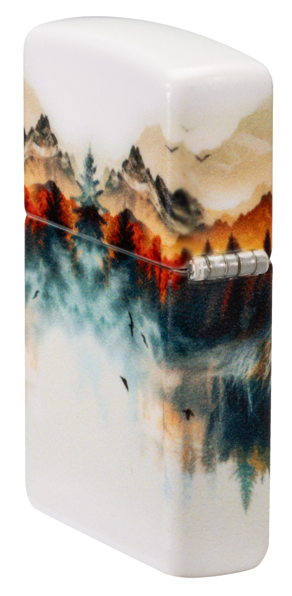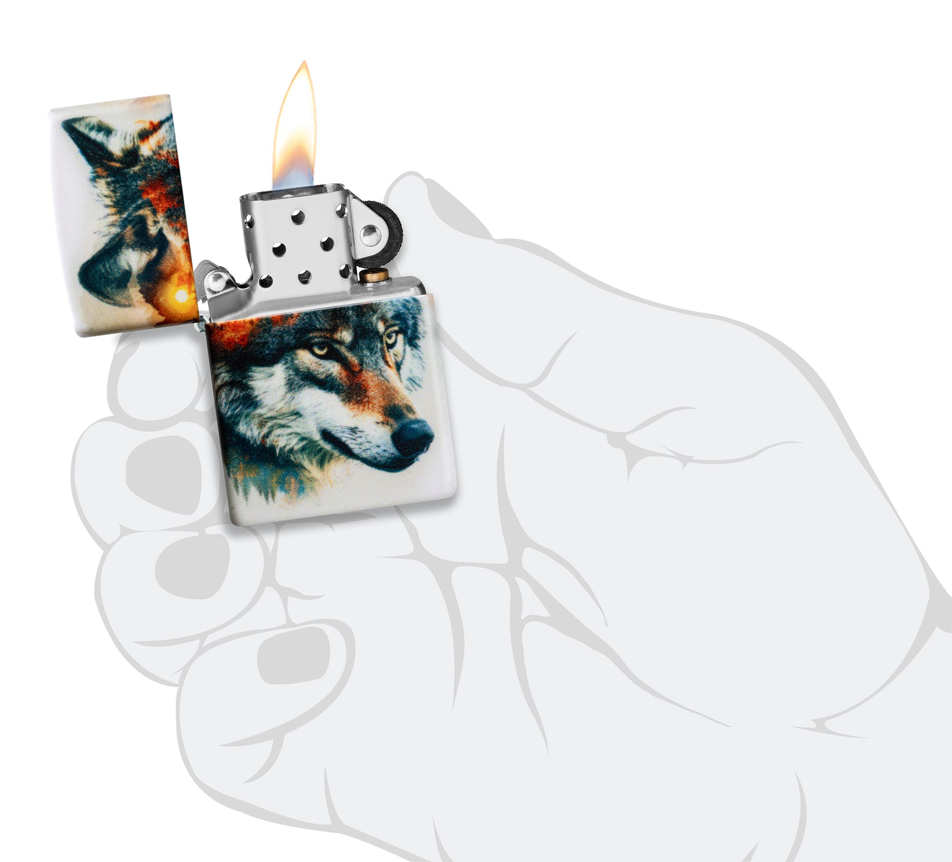 A fierce wolf looms over a brilliant landscape, which extends around all sides of this classic 540° Color lighter in a vibrant, seamless design.
