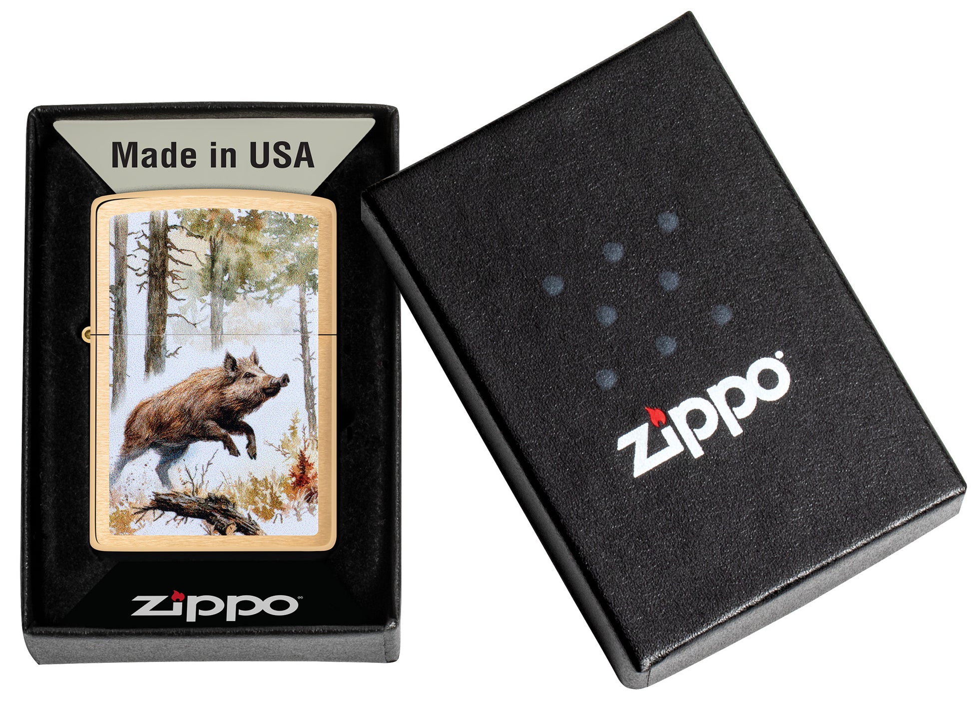 One of the widest-ranging mammals in the world, the wild boar is known across the globe for its power, intelligence and speed. This classic Brushed Brass lighter depicts the notorious animal leaping through the woods in a vibrant Color Image design.