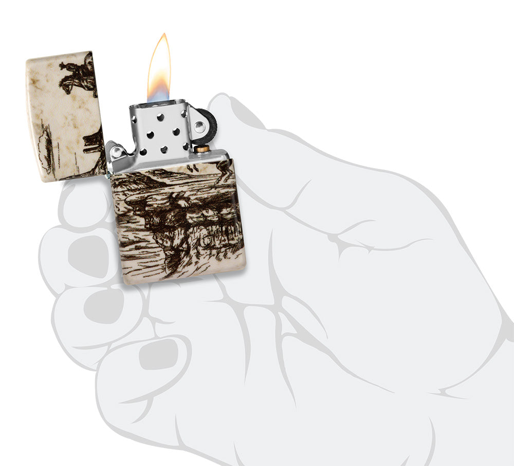 An lone rancher surveys the rugged frontier on this 540 Color lighter, which features the intricate monochromatic design on all sides.