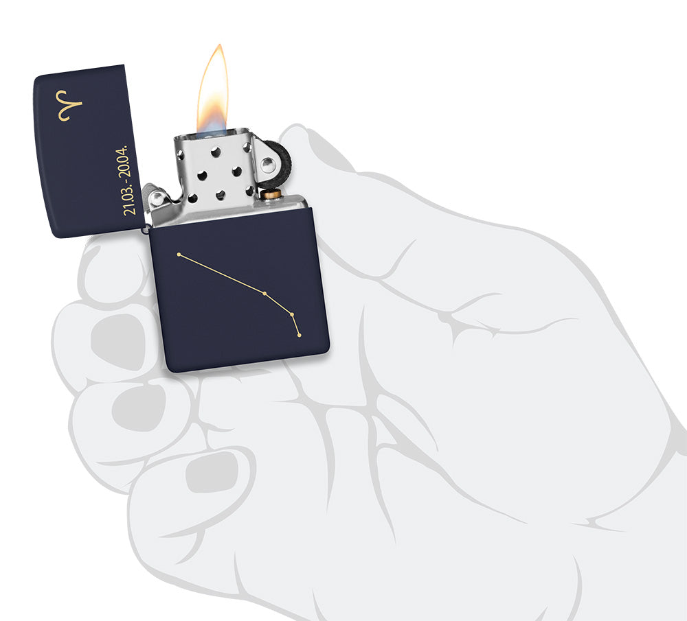 Embrace the confidence and ambition of the Ram with this Navy Matte lighter. The Aries constellation gleams beneath the zodiac symbol and the astrological dates in a crisp Laser Engrave design.
