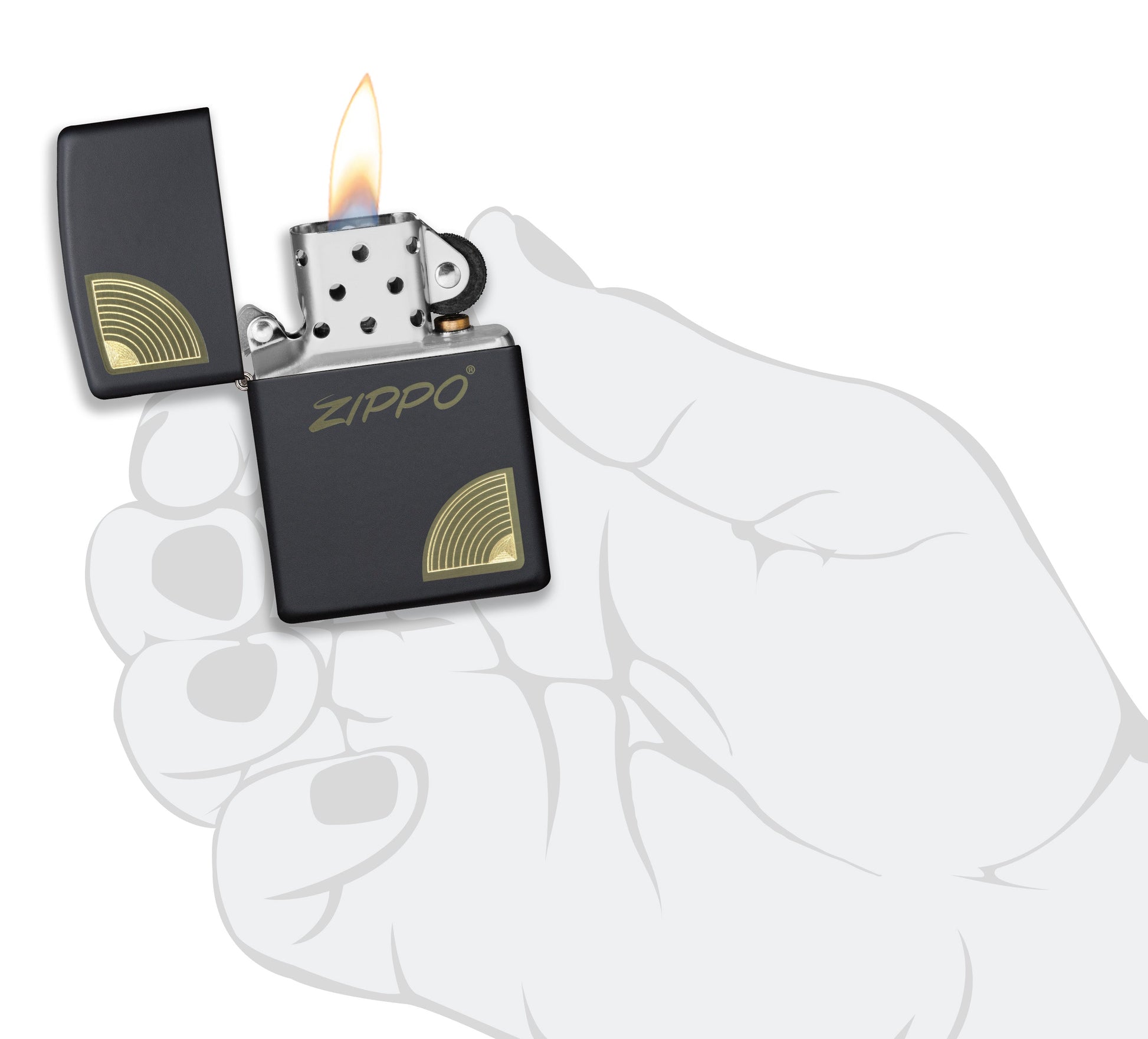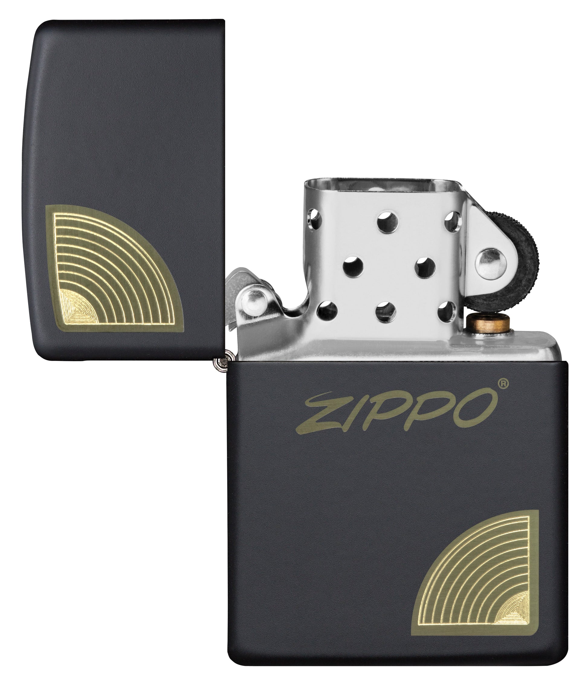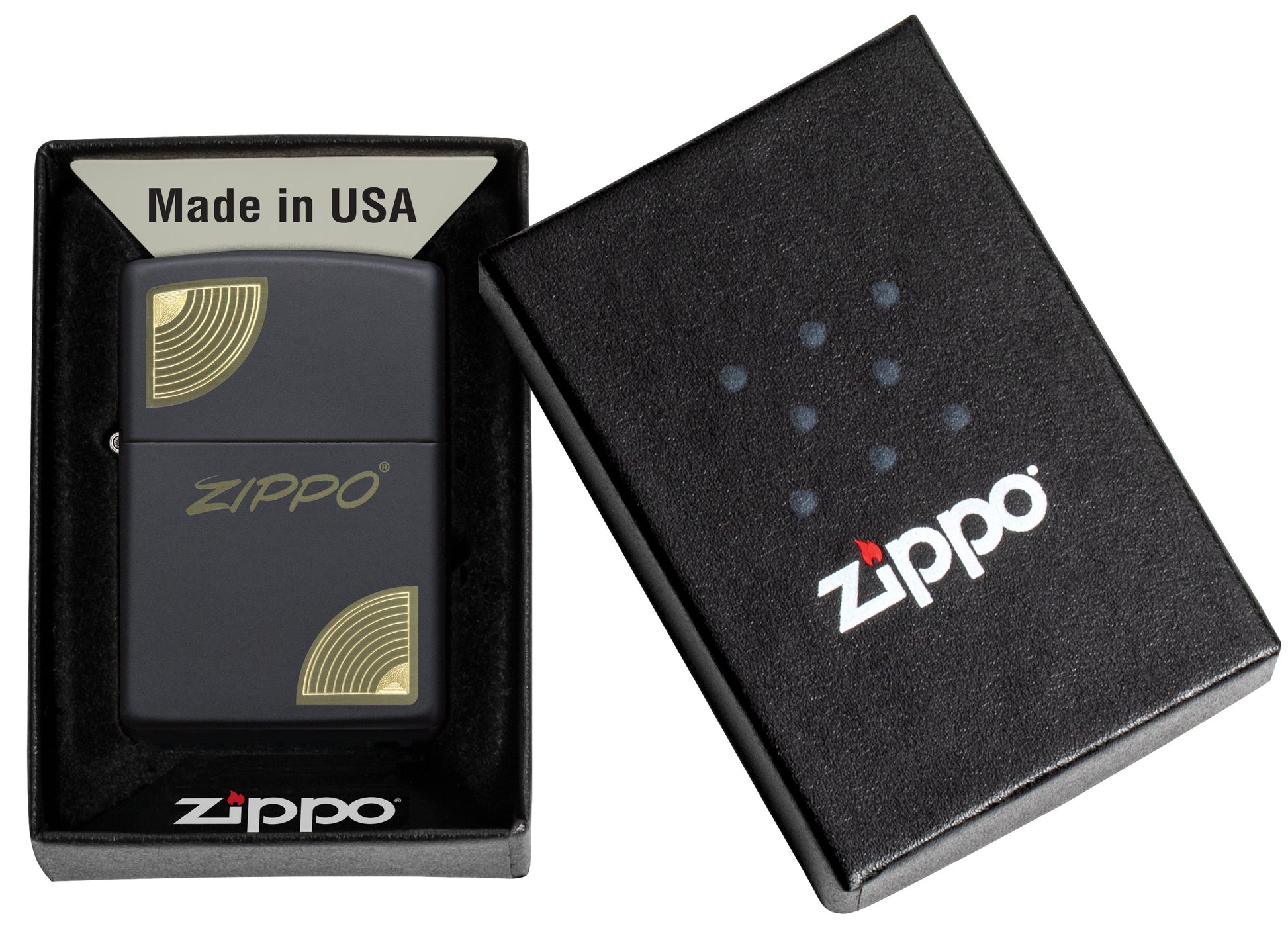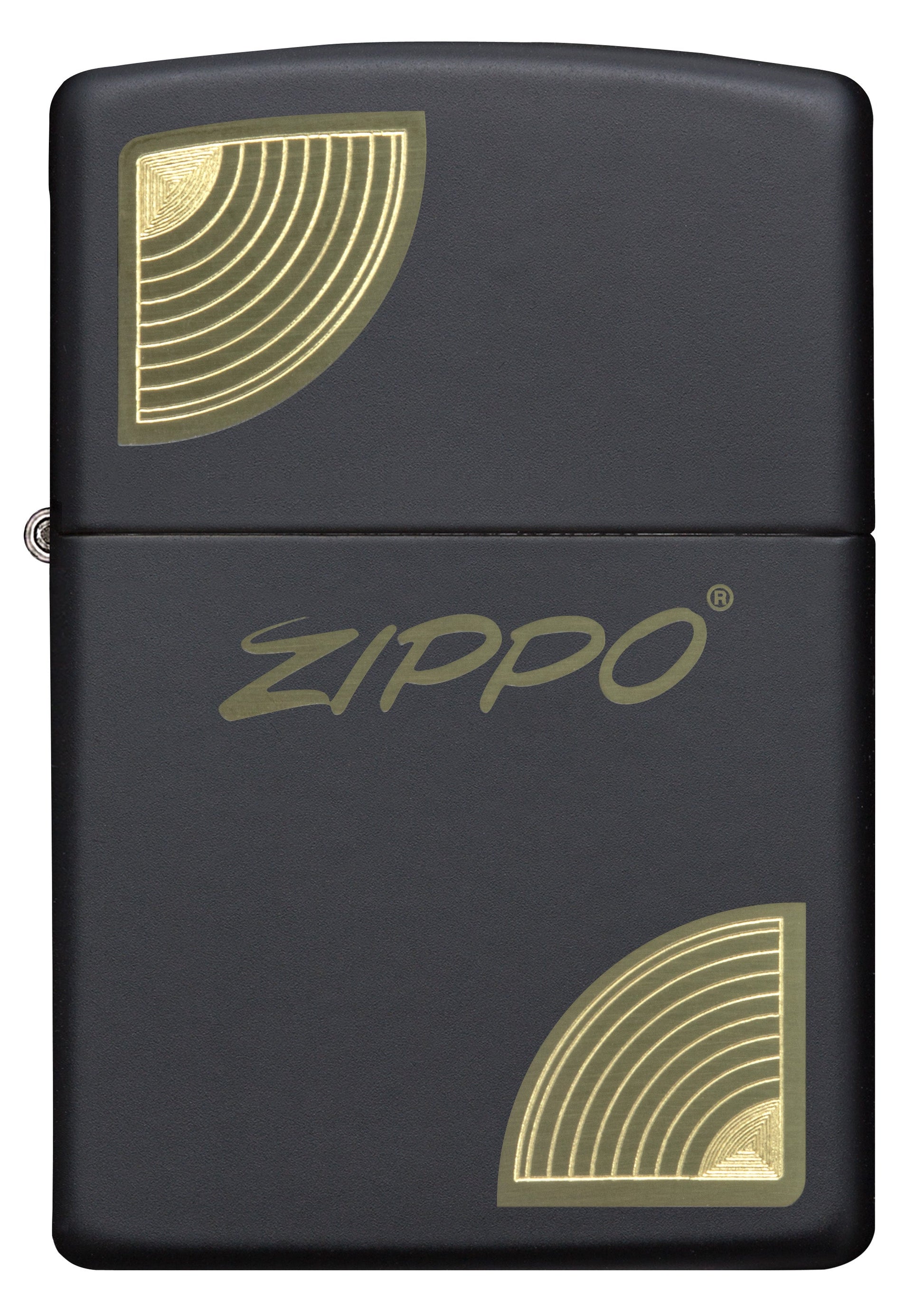 Using our laser engraving and autograving processes, a classic Zippo logo is anchored at the corners by a simple curved edge on this classic matte black lighter.